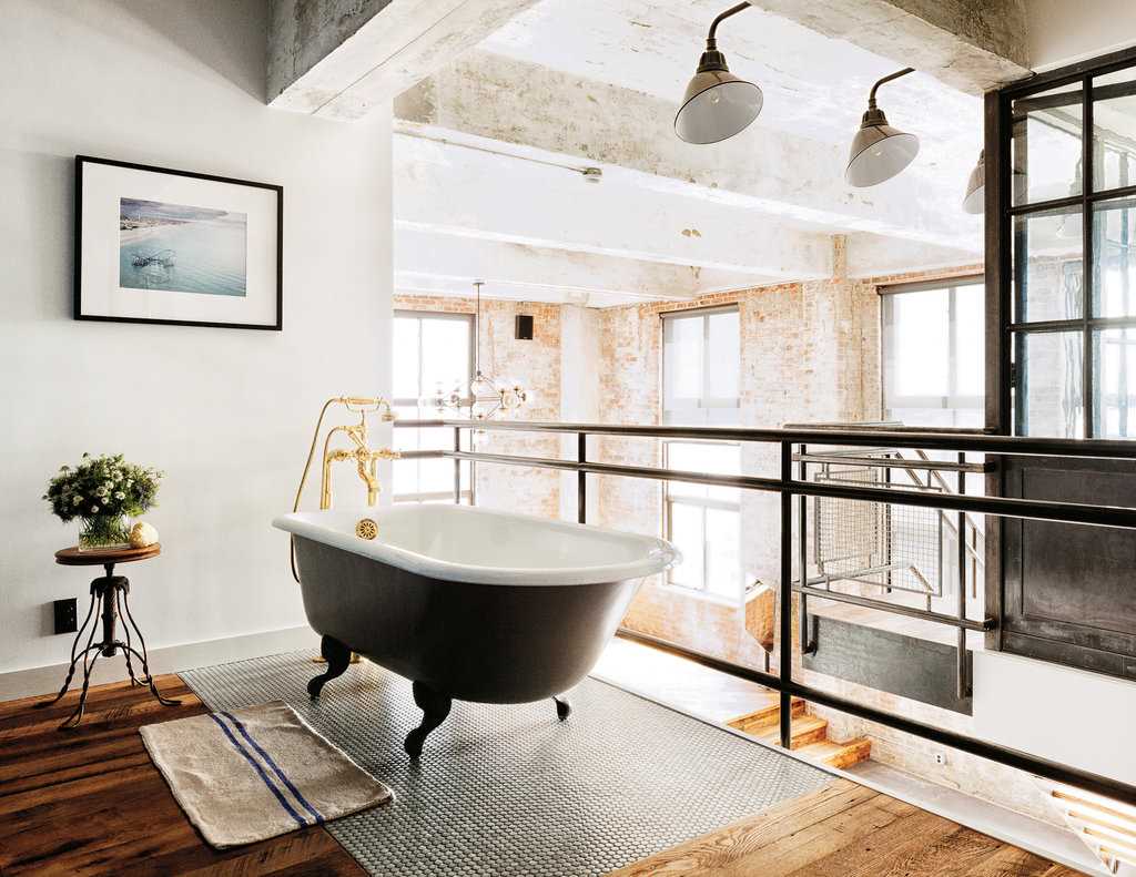 Imitation of masonry on the walls; laminate or tile, stylized as concrete, or stone for floor design; rough, massive wood or metal furniture and accessories. |