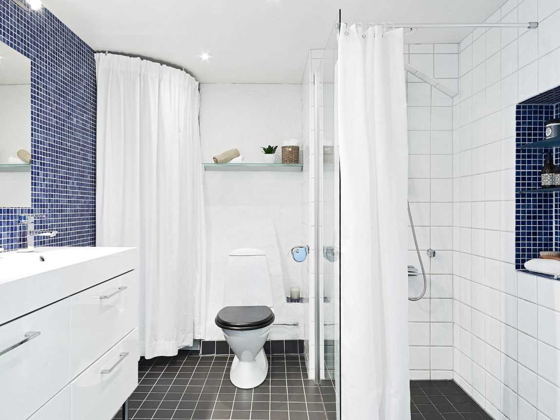 Regardless of which color you choose as dominant, the principle of alternation will make the overall perception of the palette more harmonious. For example, on a light background, there must be something black. It can be a shelf, sconce, towel or decoration. Or if the walls and floor are black, traditional bright plumbing will look good against their background. Also, when finishing the floor and walls of the bathroom, partial use of tiles with an ornament of the opposite color will help to cope with this task.