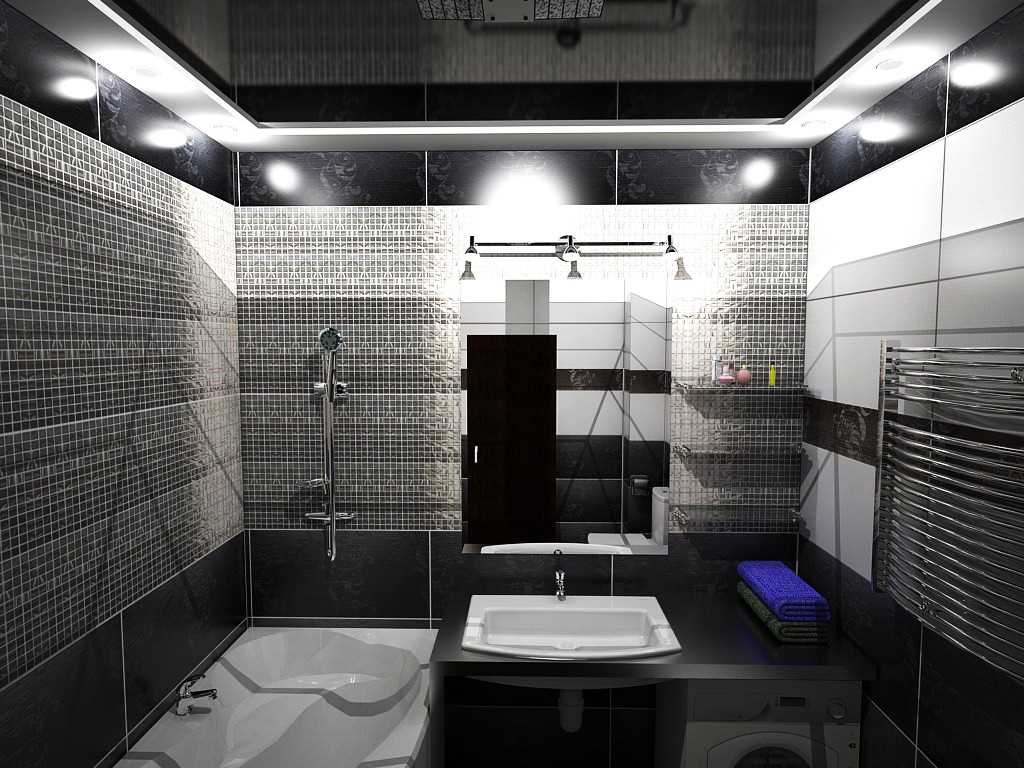 In order to make the bathroom more comfortable and cozy, it is necessary to provide bright multi-level lighting in it. In addition to the central lighting fixture, also use the integrated LED bulbs. They are located not only on the ceiling, but also in niches on the walls, near furniture and even on the floor. Sconces and small lamps can serve as a frame for mirrors. And if the size of the room allows, then you can arrange floor lamps, especially in dark corners or at a place where black is concentrated.