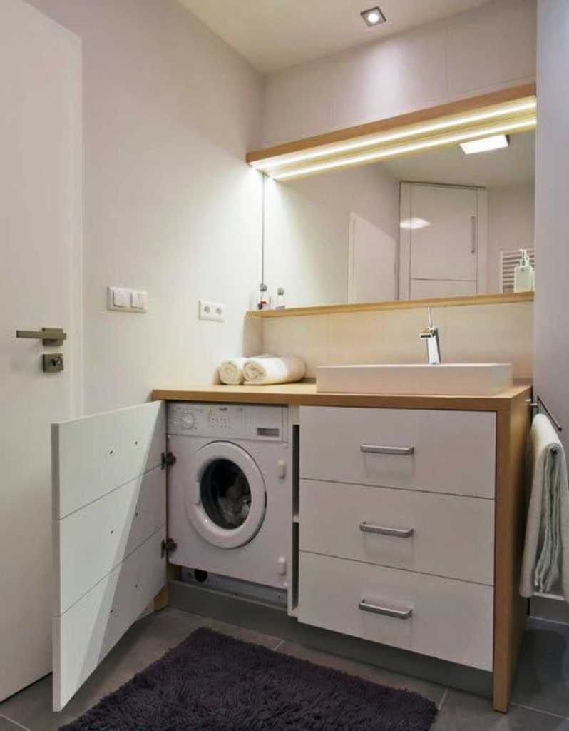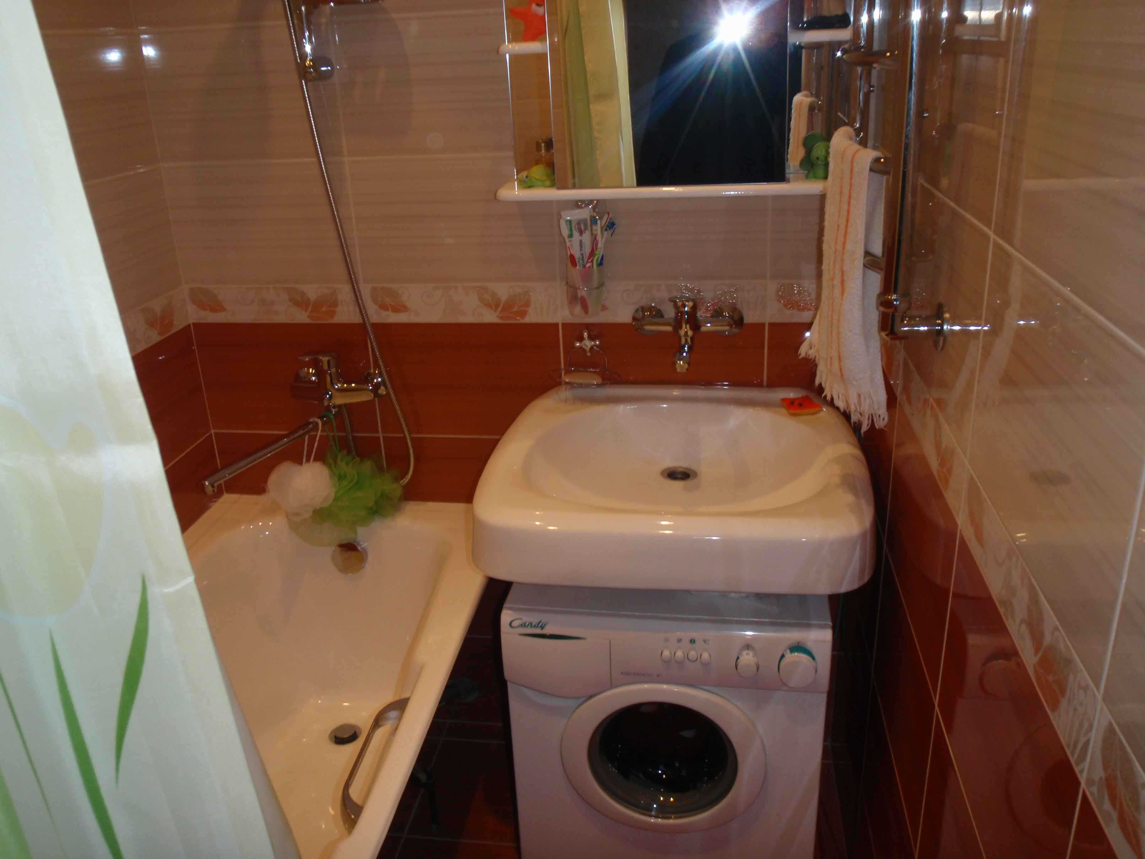 Designers do not recommend installing a washing machine in a small bathroom. This household appliance should be moved to another room, such as a kitchen. If this is not possible, you will have to choose a small and narrow washing machine, on top of which a sink will be mounted. In this case, it is necessary to choose a model with horizontal loading.