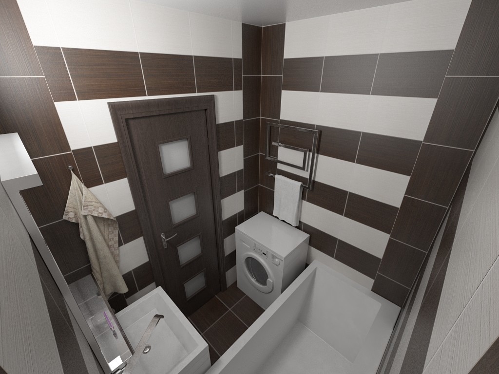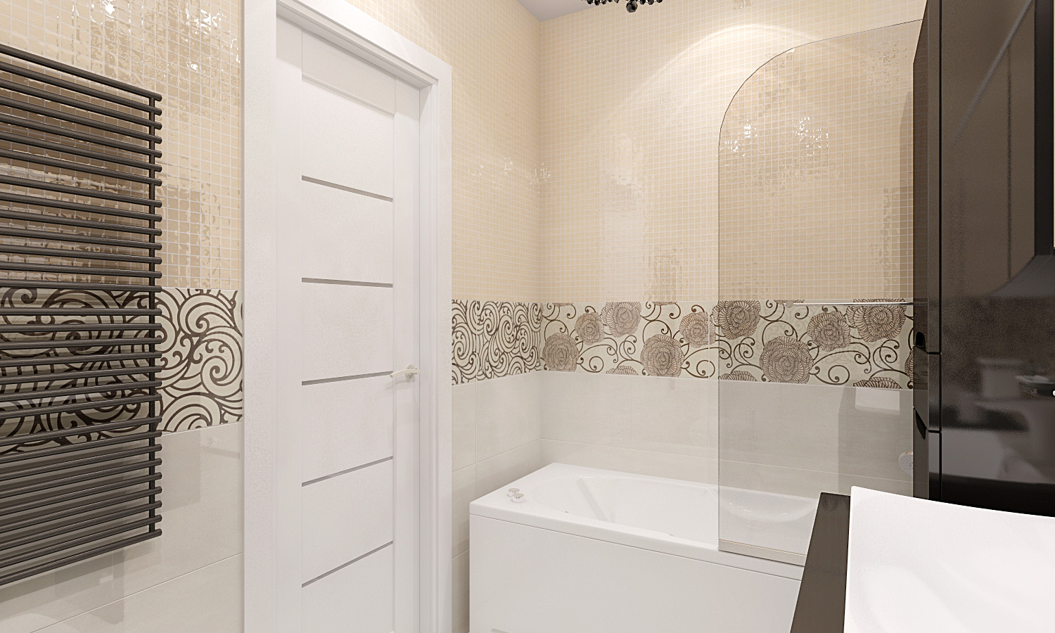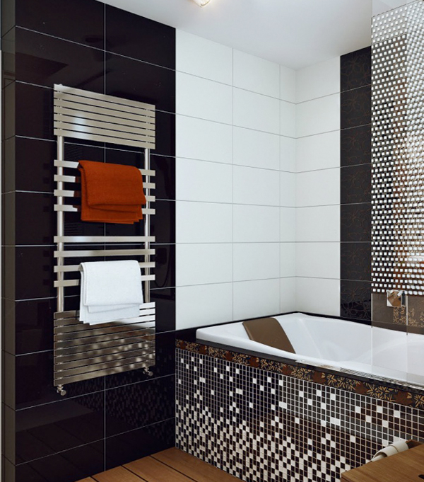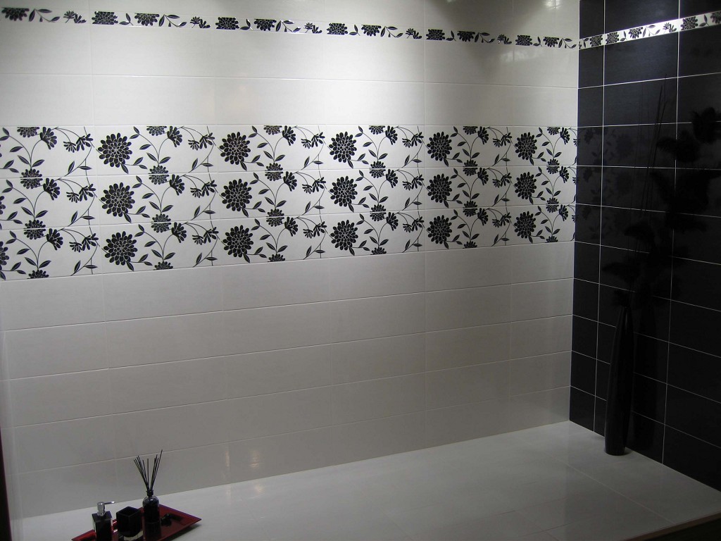 The design of the bathrooms with tiling is not particularly limited, but it is important that there is no sensation of narrowing of the walls or overhanging ceiling. This happens when the black floor and ceiling with light or mirror walls.