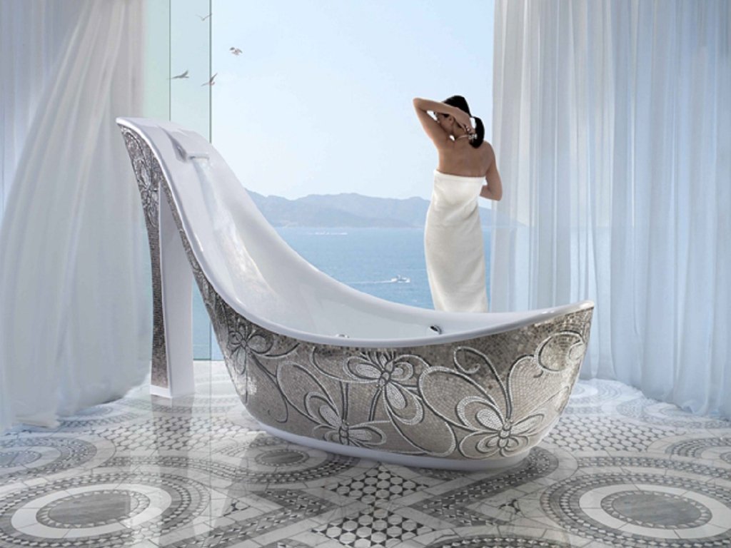 - It is convenient to finish round surfaces with a mosaic. So you can highlight the bath, wash basin, niches, shelves.