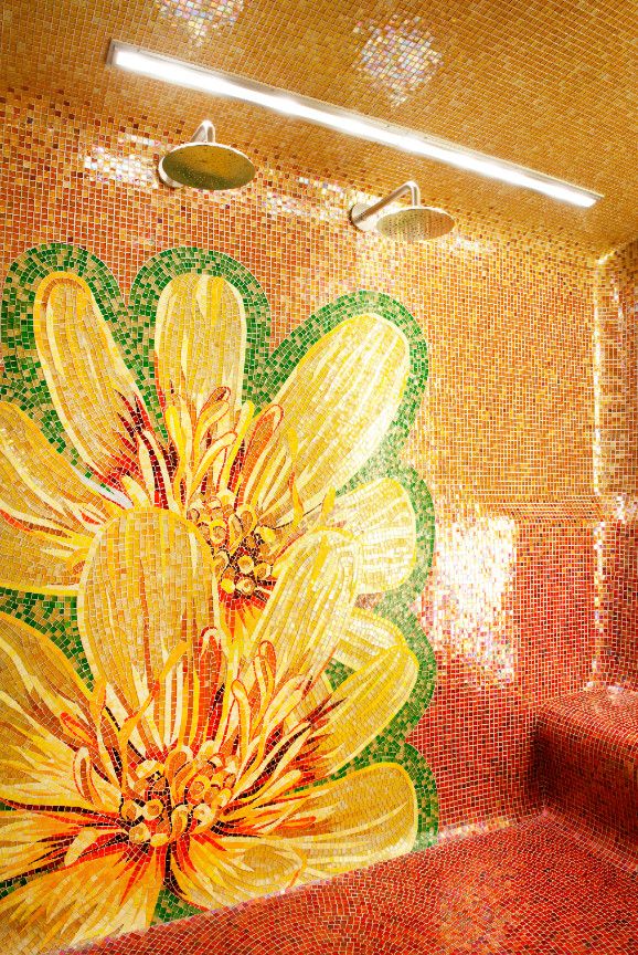 Mosaic decoration is painstaking work, it takes a lot of time, therefore it is often combined with ordinary ceramics. Against the background of the monophonic basis of the walls, floor, and ceiling, the mosaic will look more impressive.