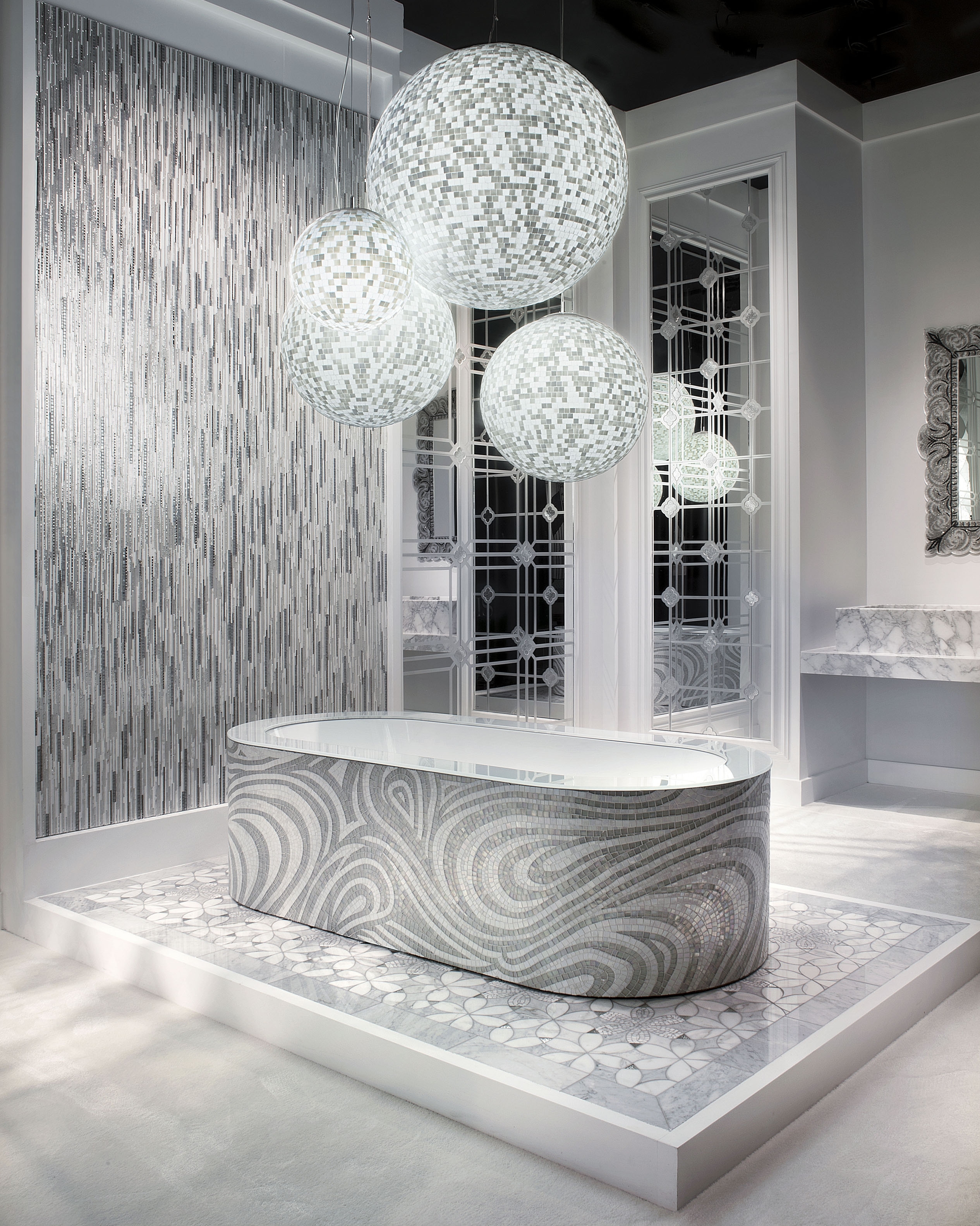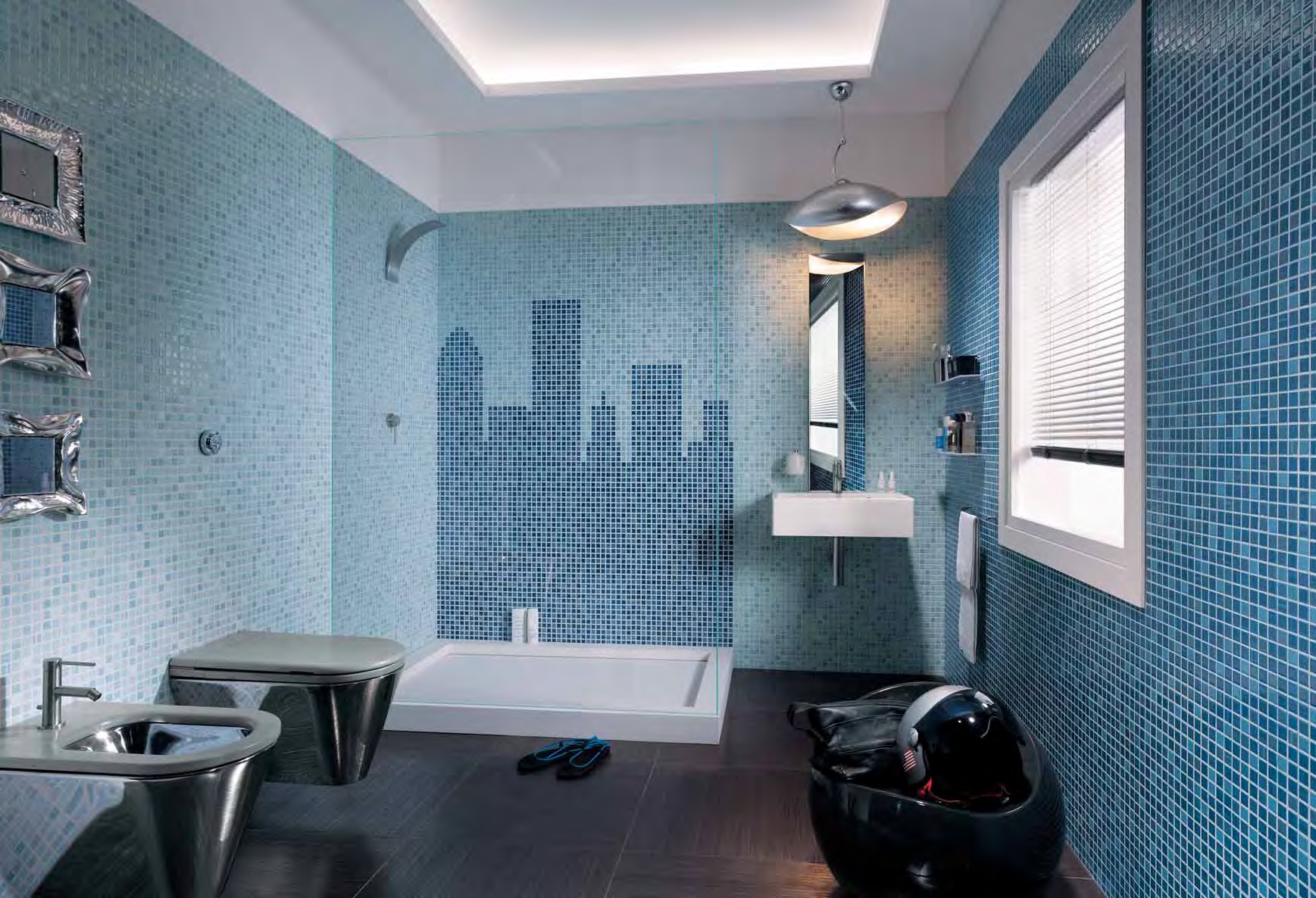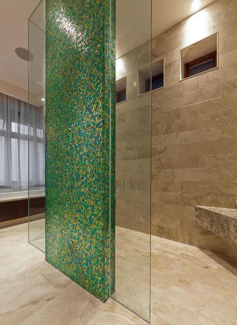 - Mosaic tiles look beautiful in combination with a glossy ceiling, LED lighting.