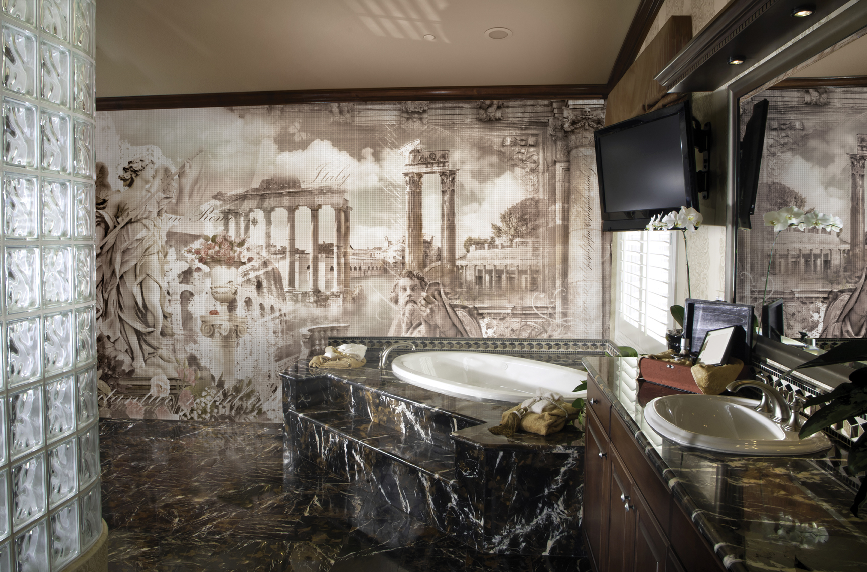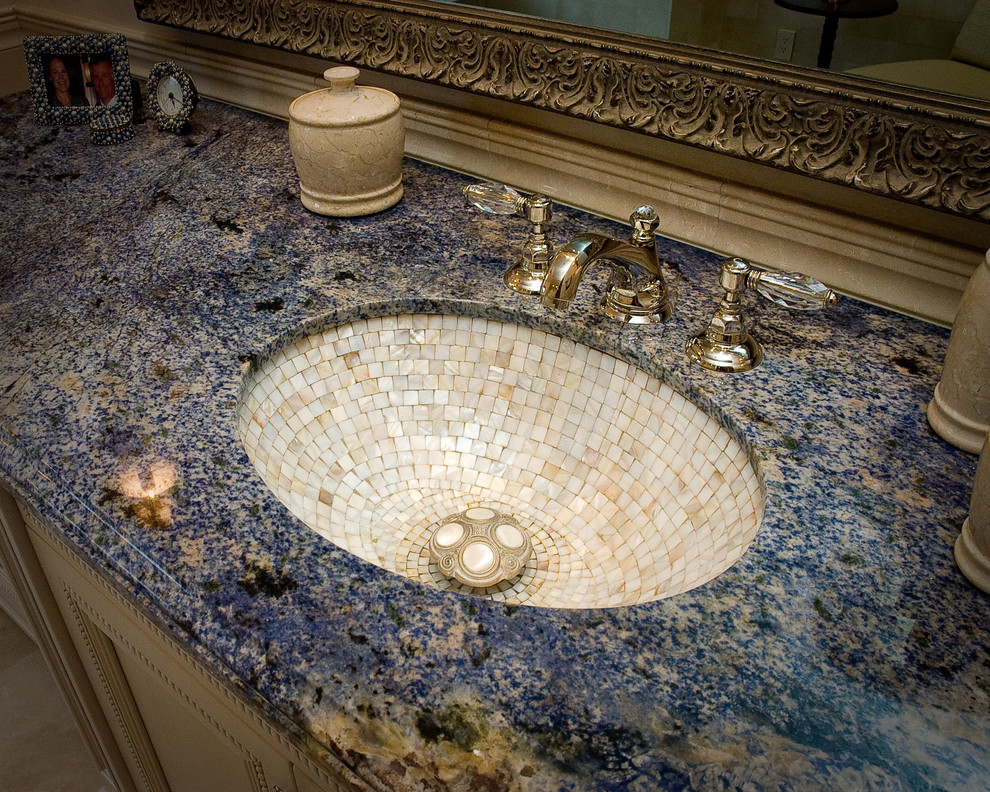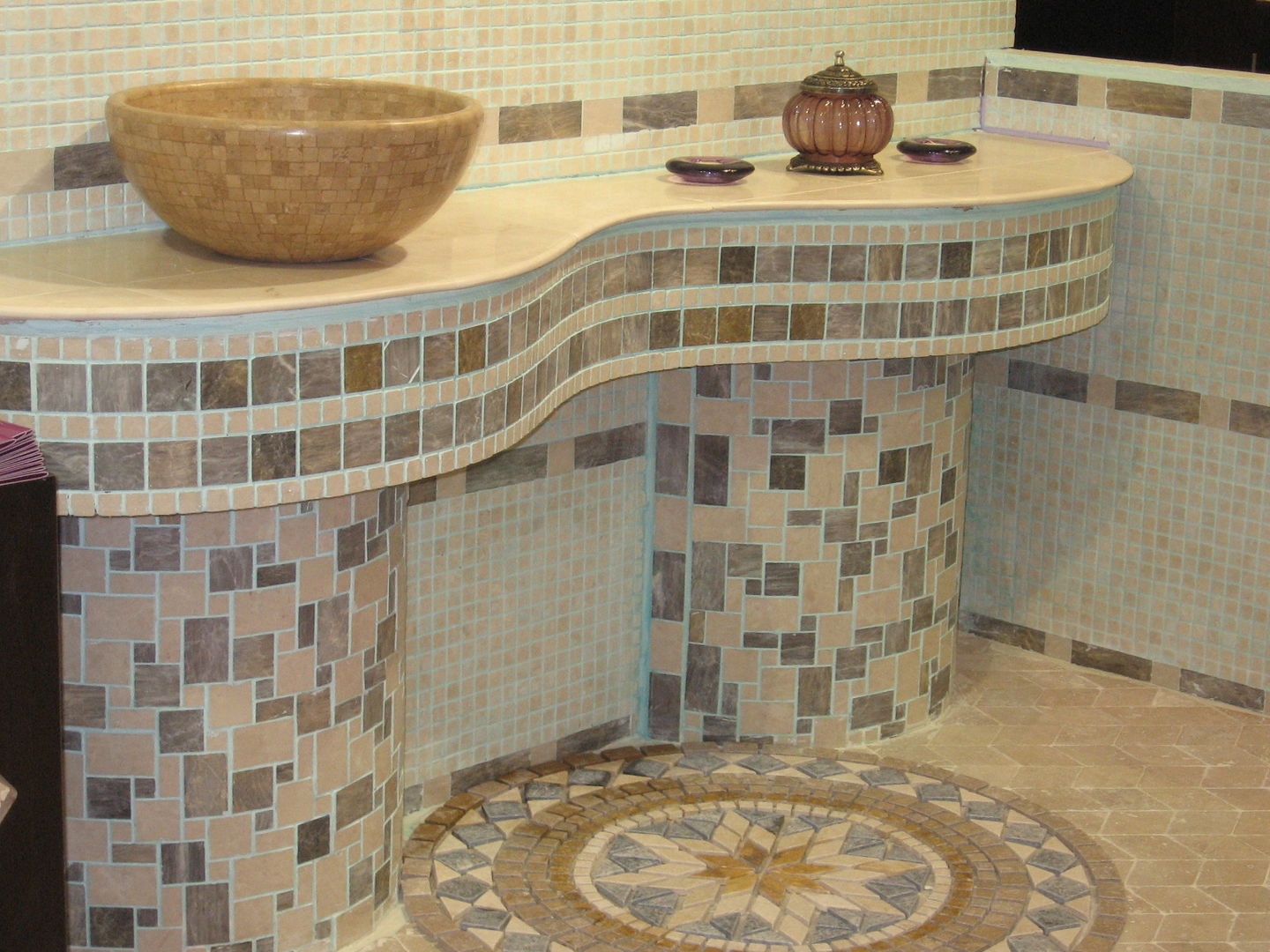 The high price of natural stone.Slightly lower cost of artificial. | Operational properties depend on the type of stone. Due to brittleness and high moisture absorption, limestone is not recommended for use in the bathroom. Stone mosaics perform the total cladding of walls, ceilings, floors, drawings, ornaments. |
