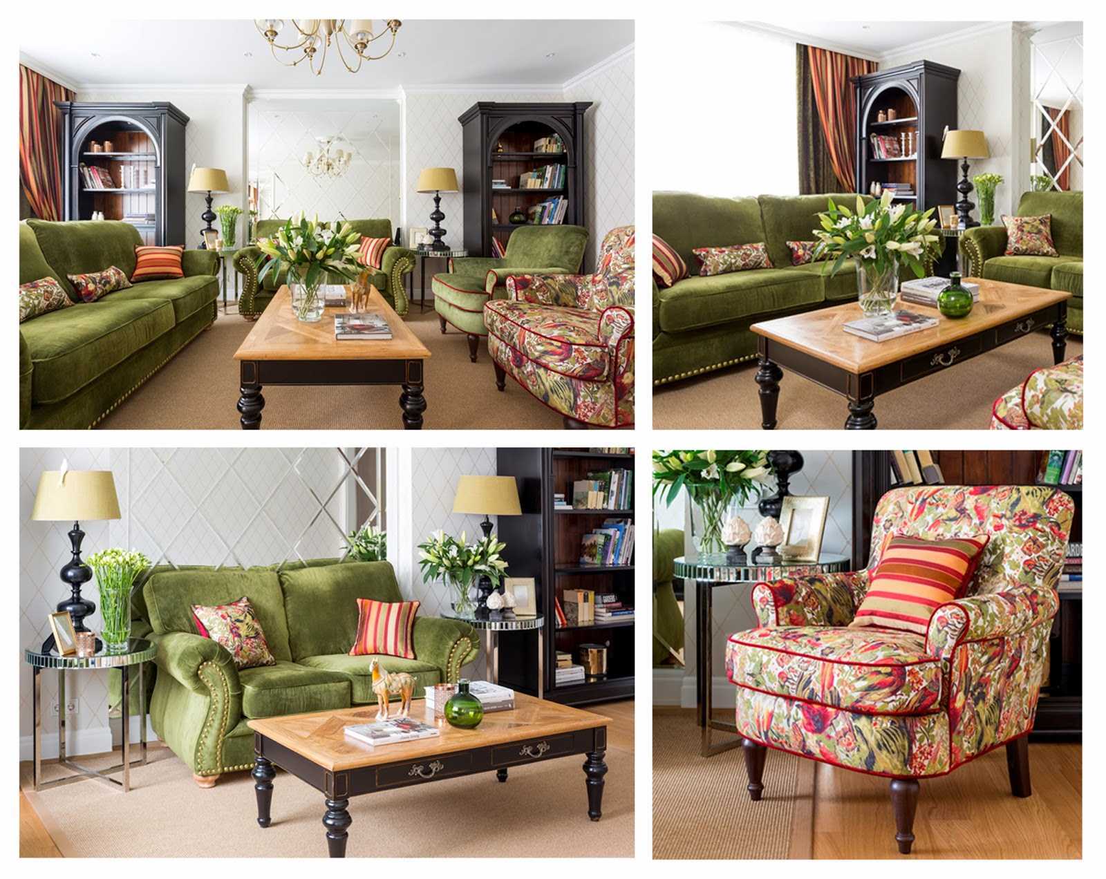 The walls behind the sofa are decorated with paintings or panels. The house will take on a different look if you change the zone lights and install a new chandelier. Lay a rug of fine textile on the floor; a vase with a floral arrangement will look good on a coffee table.