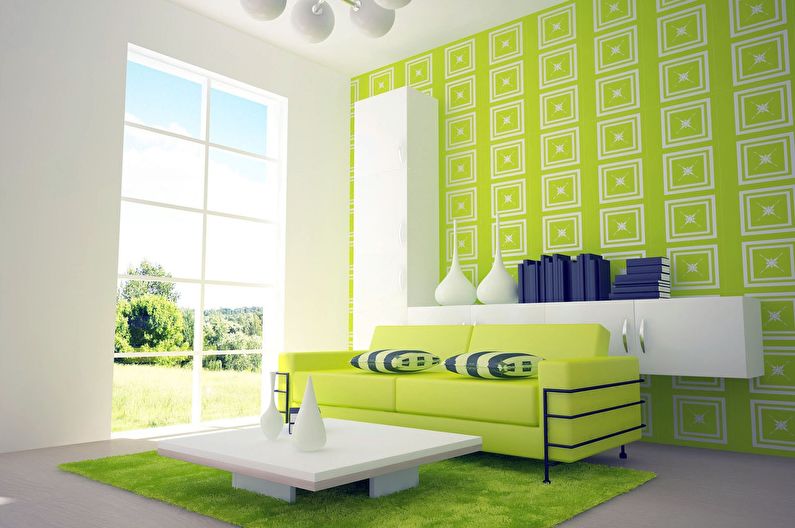 This reliable ally of green color is irreplaceable in the design of the living room, kitchen, dining room, and nursery. Most likely not suitable for a bedroom that requires a more relaxed approach.