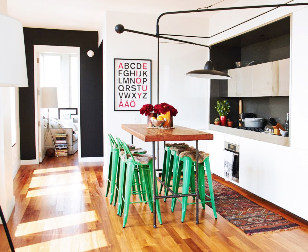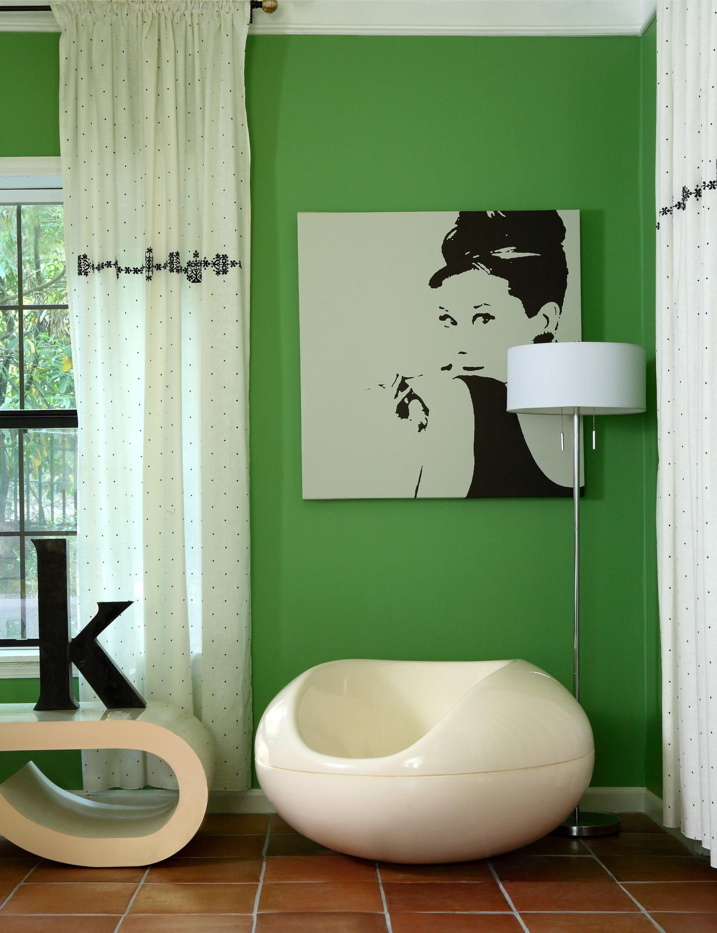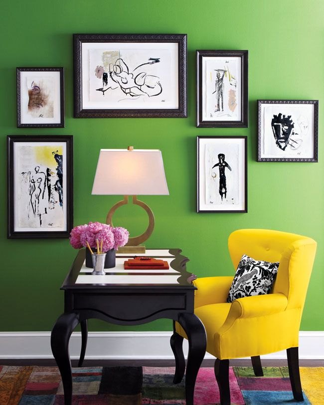 With green, black usually works in contrast. Bright yellow-green sofa upholstery and the same curtains work perfectly with dark glossy floor tiles. Black polished material next to emerald details looks expensive.