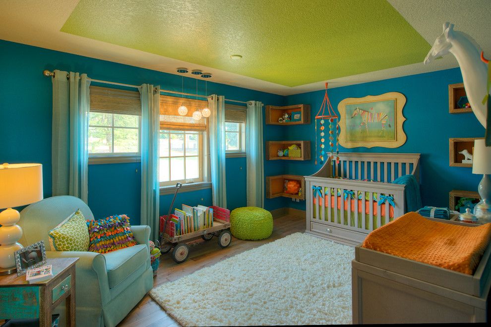 The combination of green textile with pale blue walls is great for decorating a kids room
