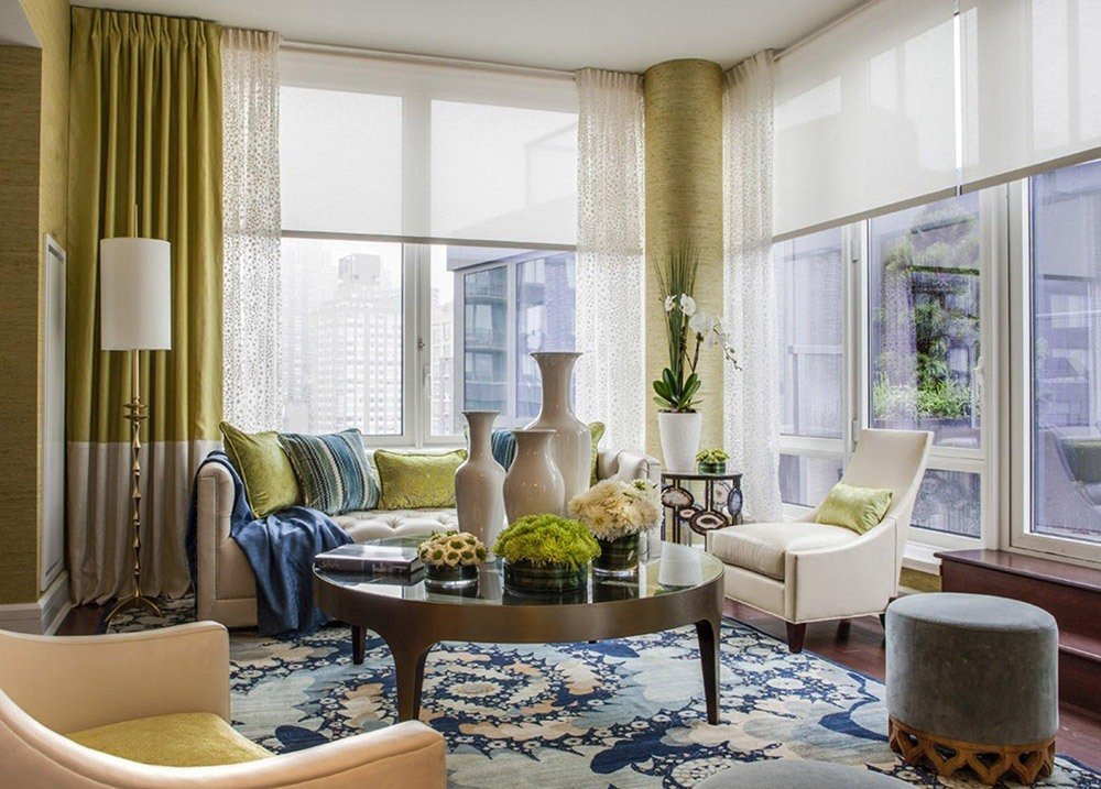 A beautiful and rich combination of green with pastel gray in the interior of the living room