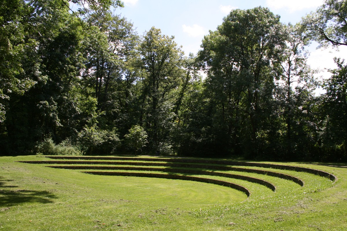 Benches, wicker fences, round baskets resembling a swarm of bees, old cars. |