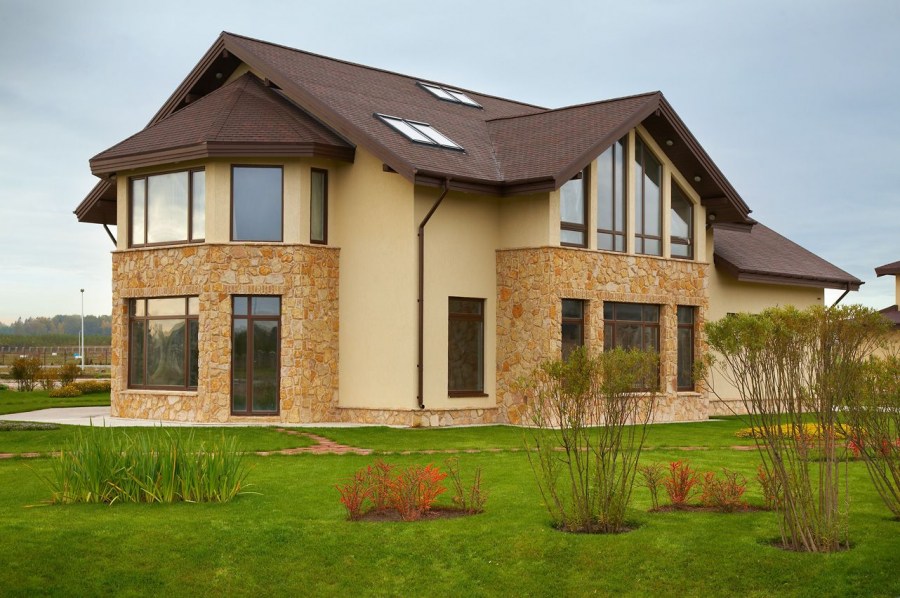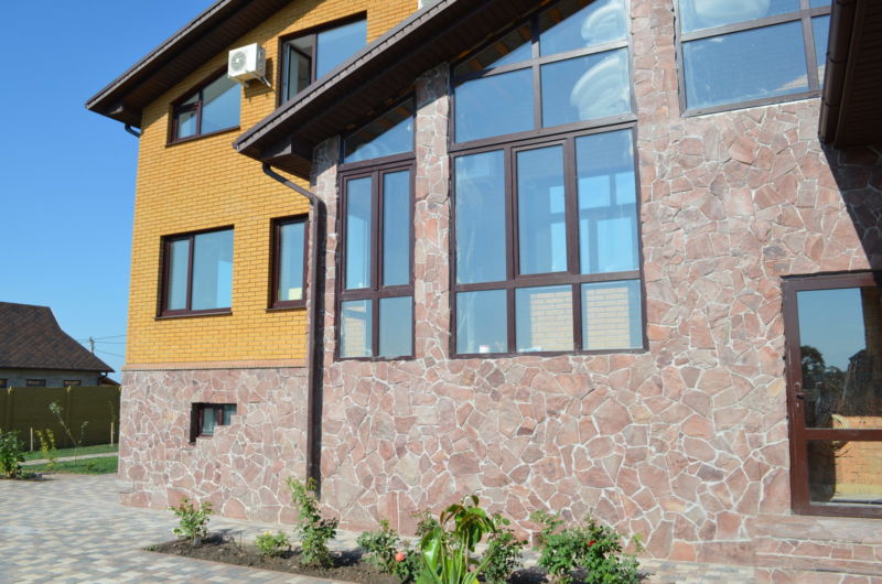 If imitation of a brick or chopped stone is used, it is worth paying attention to the color of the grouting composition in order to achieve the most expressive effect. If the base and perimeters of the openings are faced with large elements, and the planes of the walls are smaller, then the exterior becomes monumental and respectable.