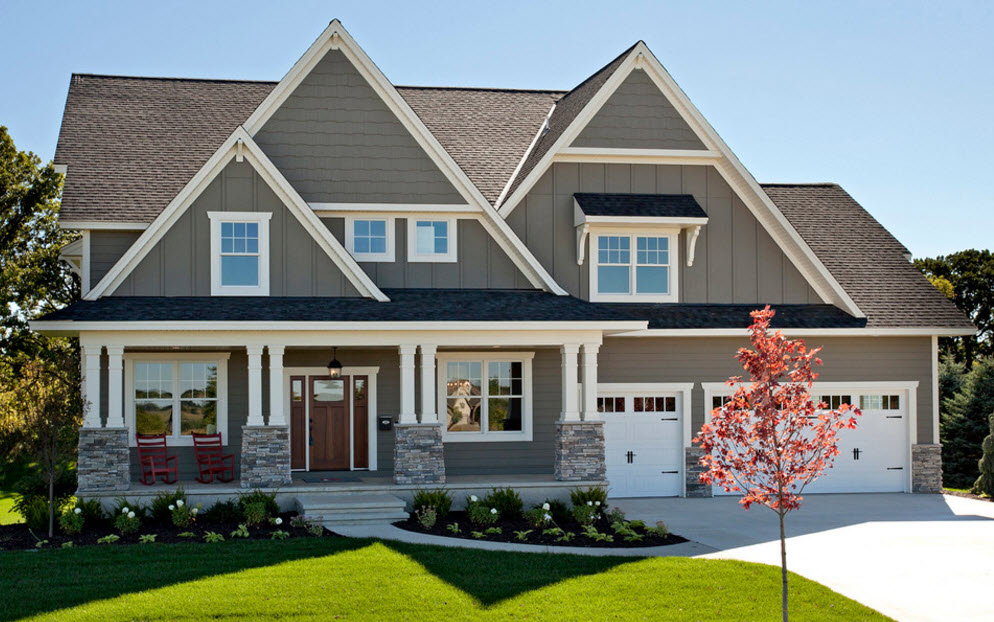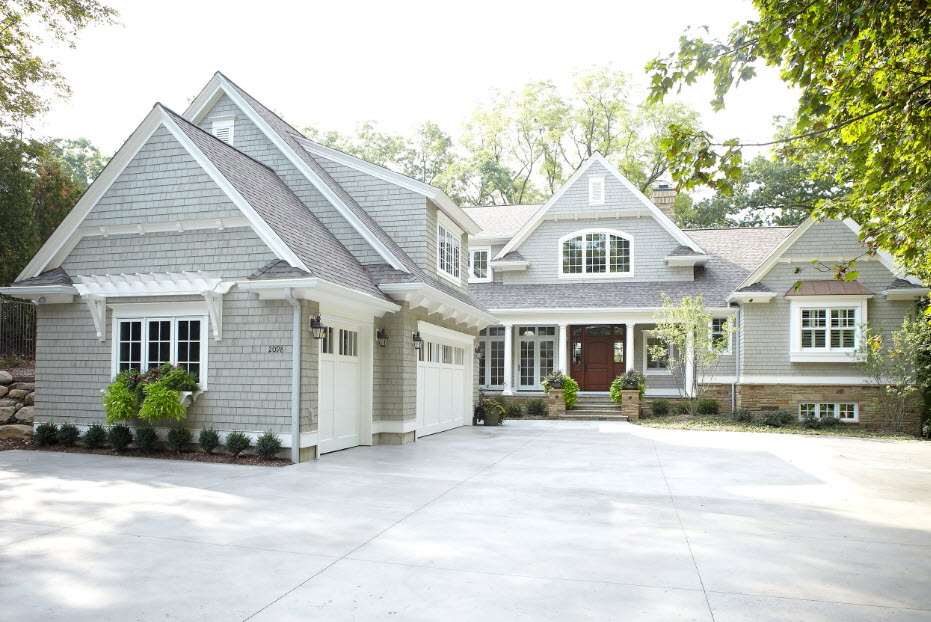 The classic way to decorate the facade is landscaping. Pastoral flower boxes or flowerpots hung from window sills, or climbing roses, grapes and ivy, wrapped around columns or crawling along walls and shading windows, will become a romantic and cozy design element. The contrast of carved greenery and stone or brickwork, delicate and bright petals on a background of gray stucco will help create a unique mood for the whole house. This technique is appropriate in classic and rustic design styles.
