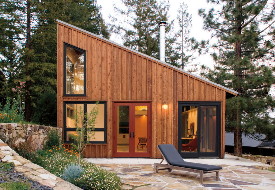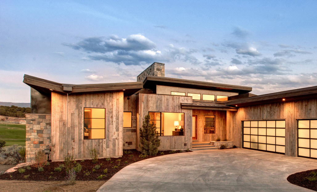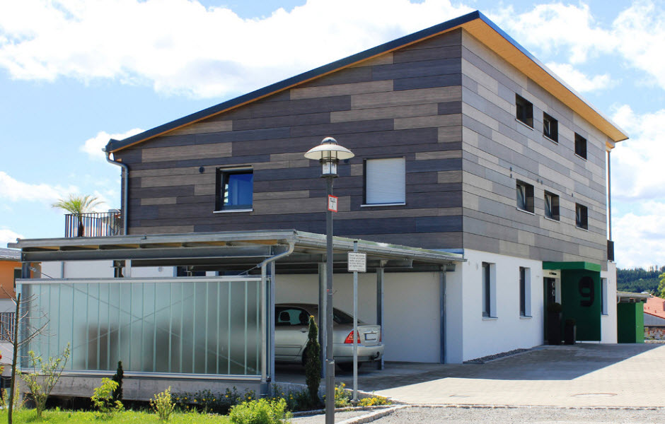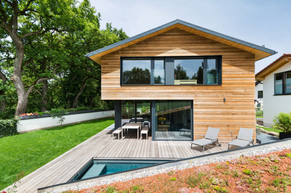 Wood cladding is organic not only in rural façade design. Imitation of glued beam in the decoration of laconic hi-tech forms looks original and spectacular.