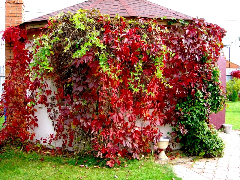 For this, girl’s grapes are used, which has dense and dense foliage, as well as various color schemes. Varieties of climbing plants are selected depending on the place of growth, and the required planting area.For example, choosing flowering plants for the facade of a house is not very prudent, and vice versa, planting non-flowering girl's grapes near a small tree. Here the choice is made according to the following principle: for a small area, blooming looms are used, and for large areas (to fill pergolas or trellises) - not blooming.