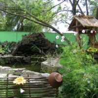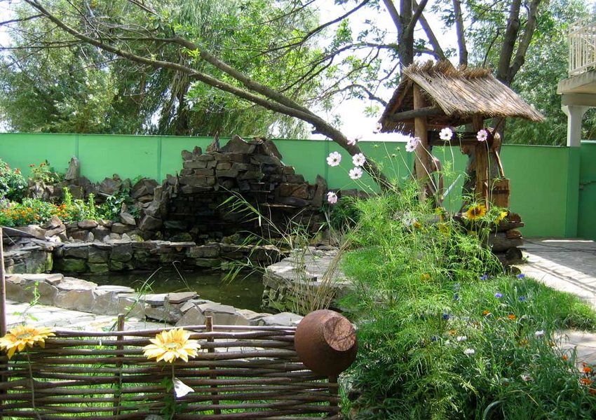 The central zone in front of the house is equipped with flower beds. A thematic composition is also possible with the use of decorative mills, small bridges and all kinds of paths, strewn with the help of multi-colored stones.