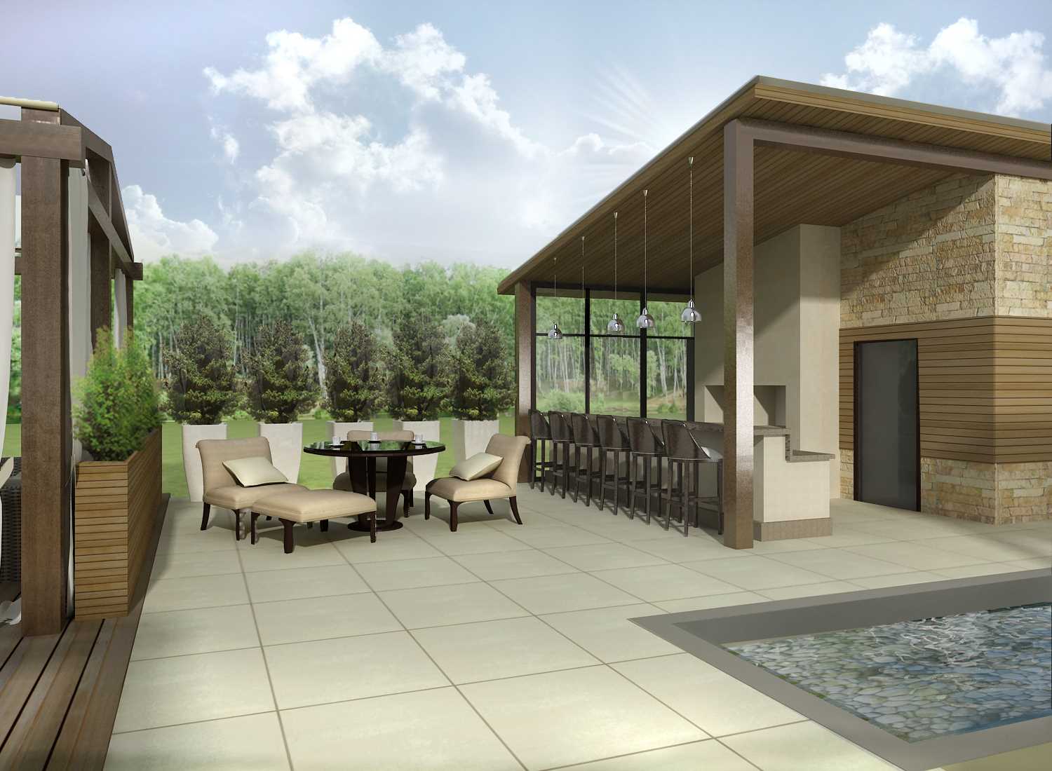 A veranda near a small pond will become your favorite place to relax.