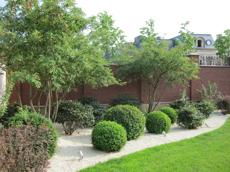 In the front part, it is customary to plant decorative shrubs, conifers. They are located in such a way that the plantings do not interfere with the penetration of sunlight into the windows of the house. Symmetrically planted spruce or fir can frame the entrance to the garden, and textured boulders will complement the composition.