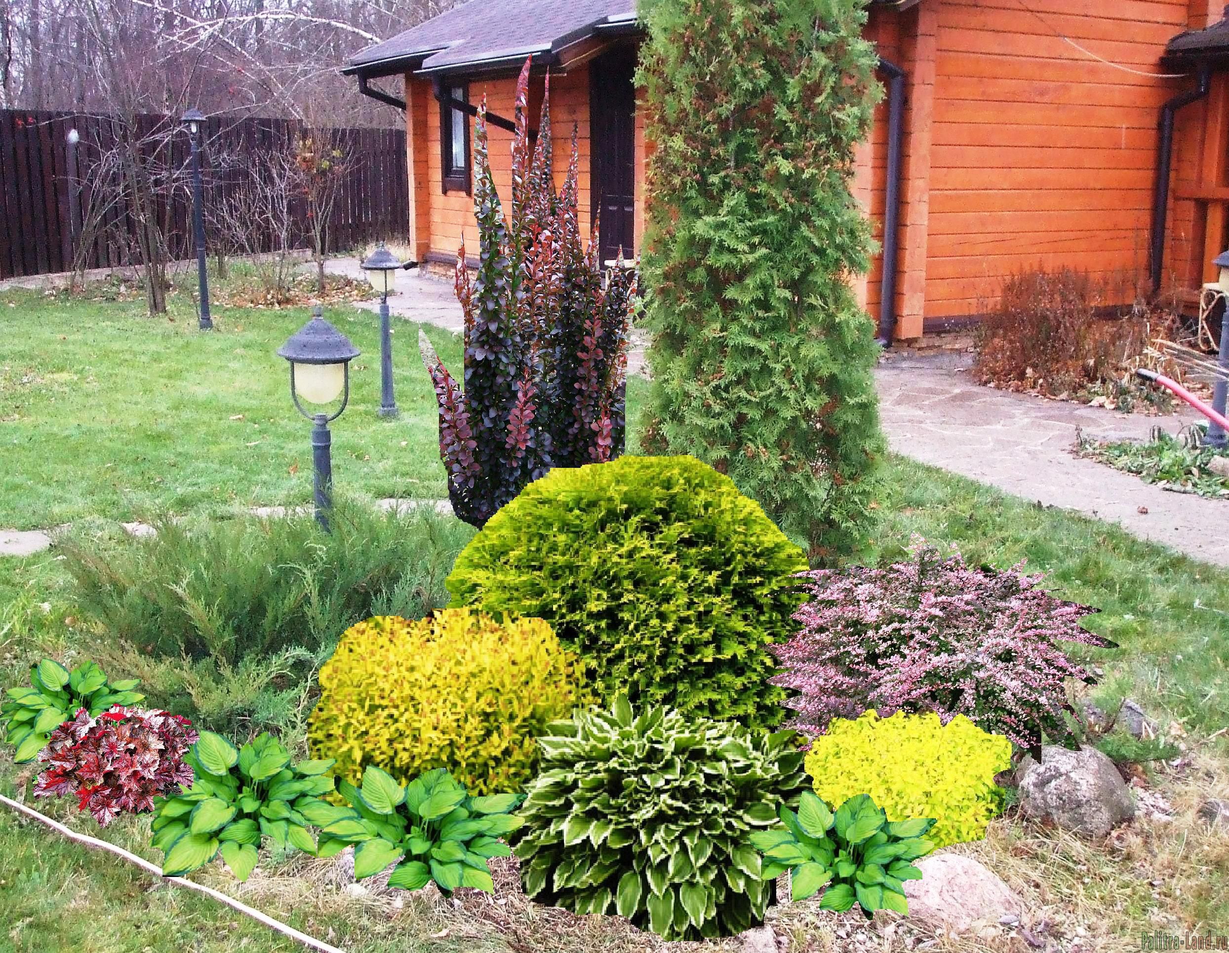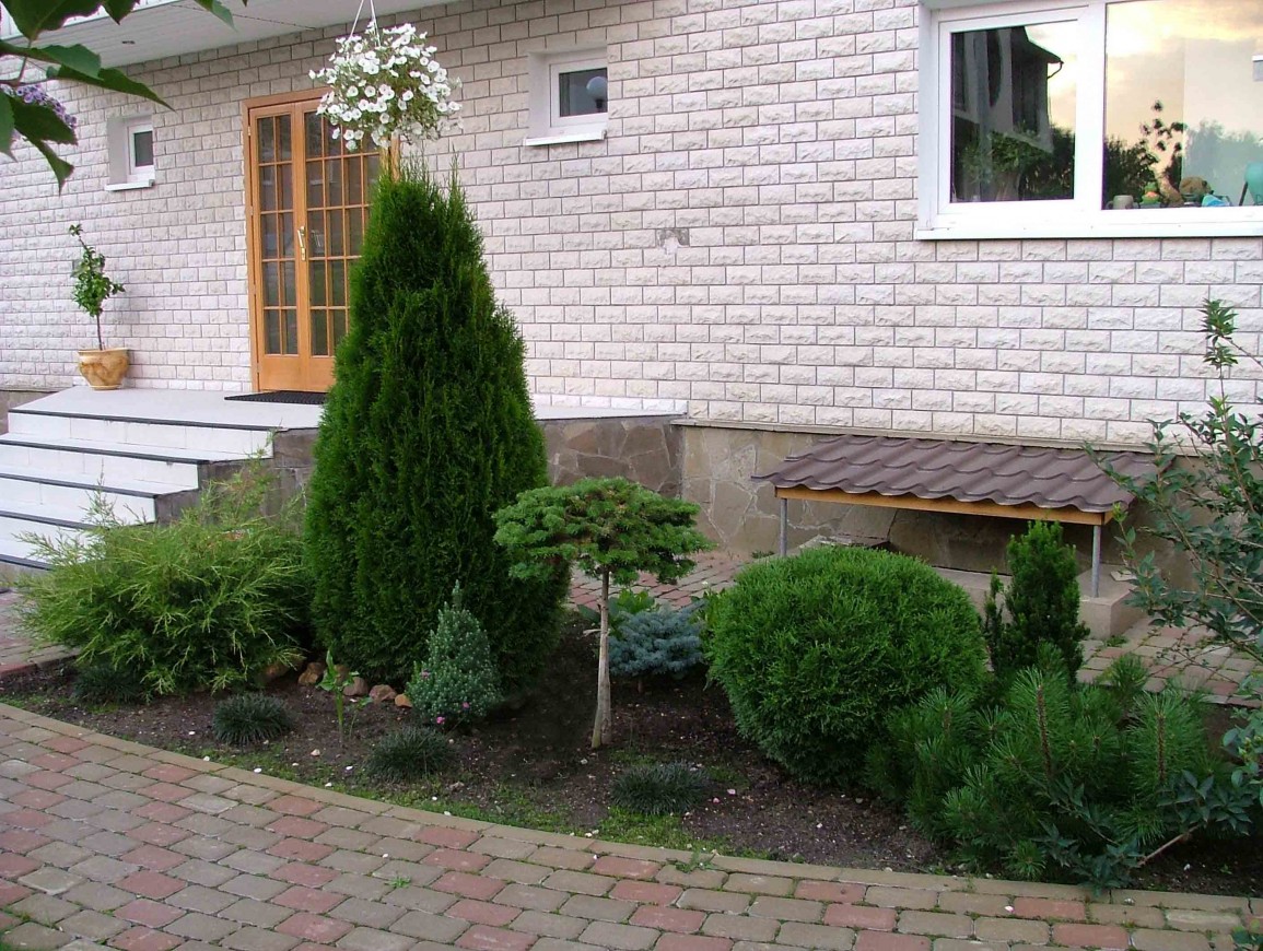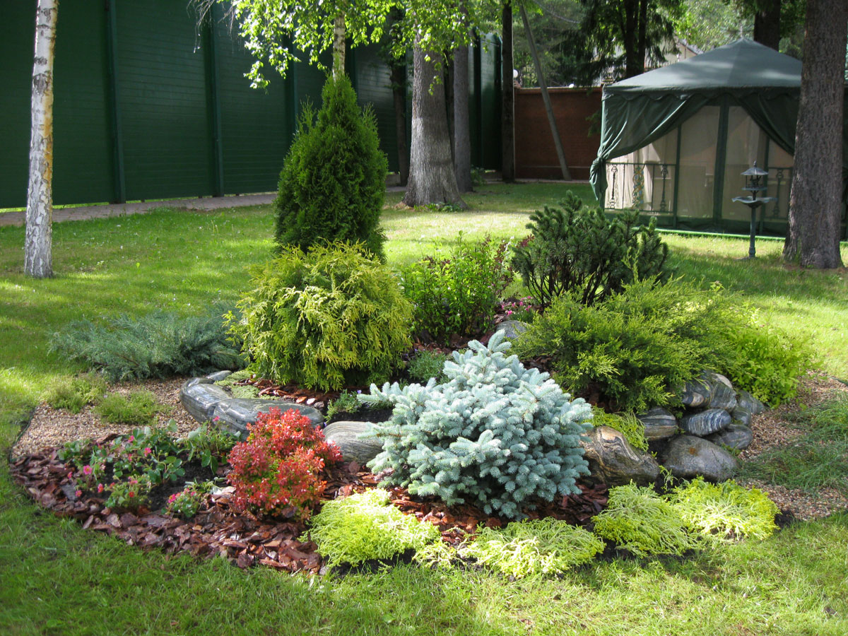 Attention! Do not plant large conifers, fast-growing and spreading forms in the center of the site and under the windows of the building. Otherwise, after 5-6 years, they will turn into forest jungle, creating an excess shadow near a flower bed or front garden.