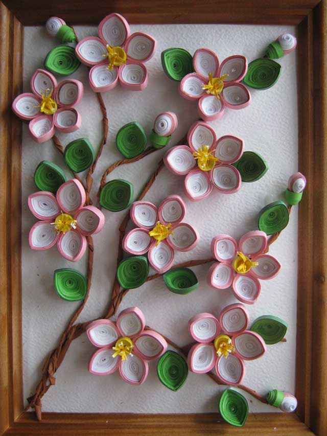 Strips of paper are folded in a variety of shapes: curls, spirals and stick to the base, making up the composition.