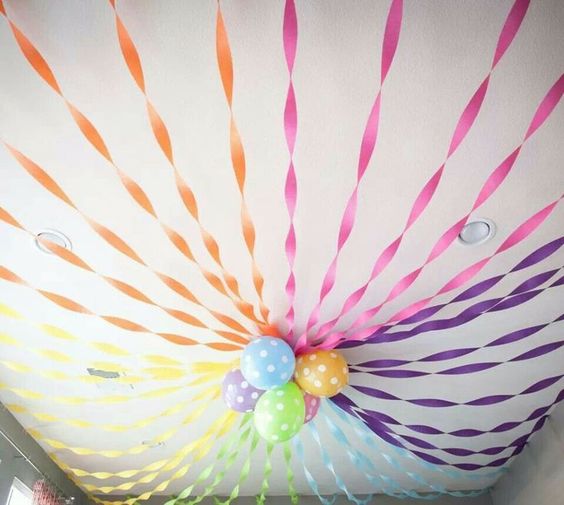 Ceiling decoration with colorful ribbons and balloons
