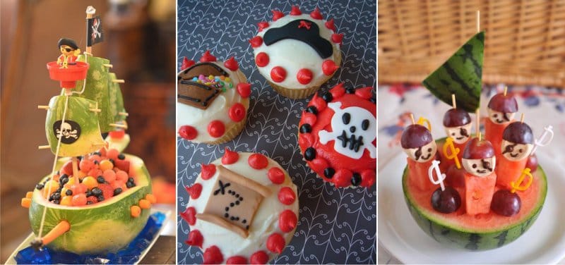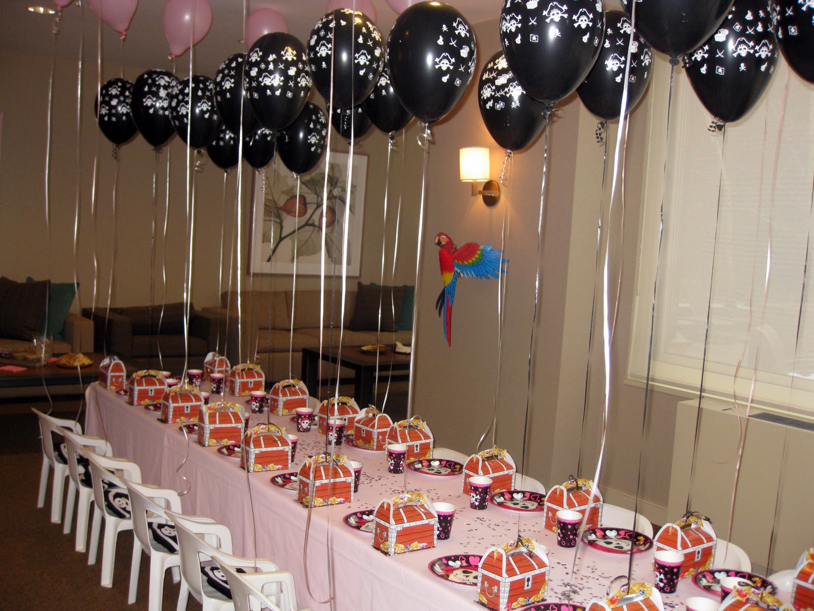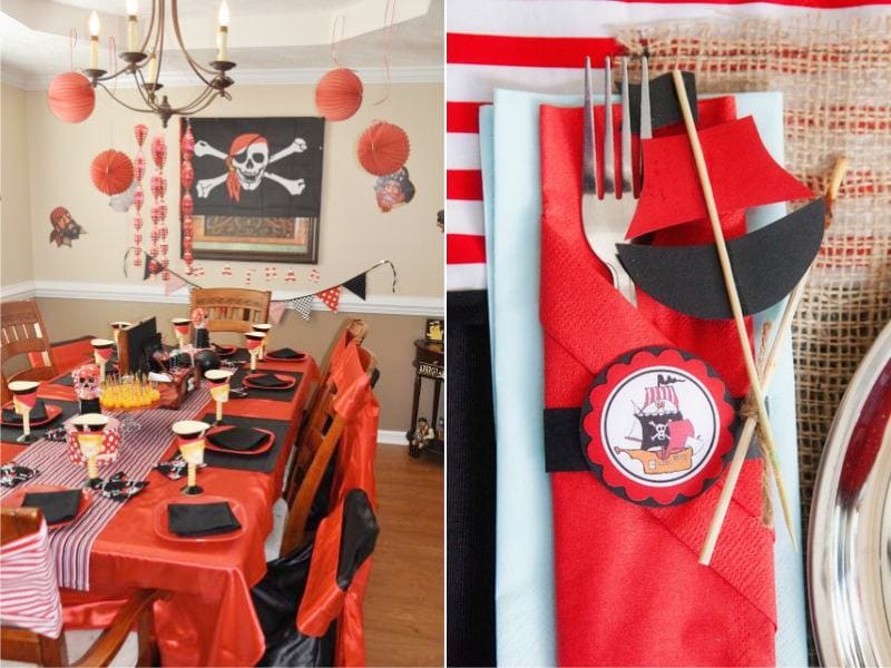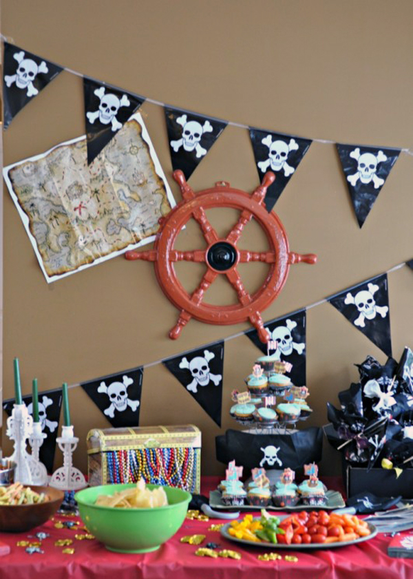- Pirate Party. A ship is made from large sheets of cardboard (black sails - from fabric). Nearby, you can install a palm tree from balloons, and under it put a chest (bag) of treasures in the form of chocolate coins and put crossed swords for the entourage. To decorate the ceiling, use a thin rope or jute rope (instead of ribbons).