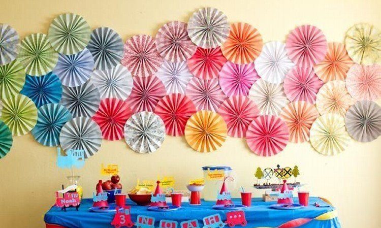 - Ready-made paper decorations for a birthday. In shops specializing in festive decoration, there are always ready-made pompons, accordion balls, garlands of tassel pom-poms, voluminous stars and flowers, flat garlands and greeting posters. It remains only to harmoniously place them in the room.