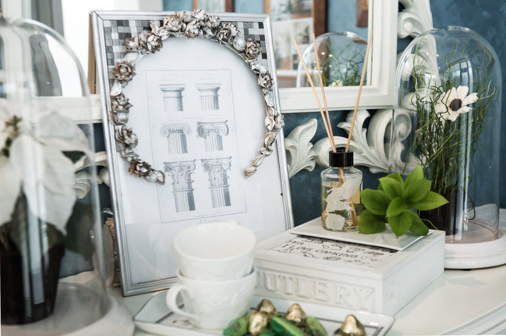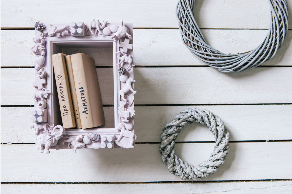 - By the way, about the framework for photos and paintings - another good topic than how to decorate a room with your own hands. This is a complete decor that does not require special skills. Any base for the frame can be pasted over with natural material, for example, of the same size with shells brought from the seas. Further, depending on the design goals, they can be left in their original form or covered with aerosol paint and insert any photo dear to the heart. Several works are proposed to be hung on an accent wall in one of the rooms. In the same way, it is easy to give originality to the mirror in the hallway or bathroom.