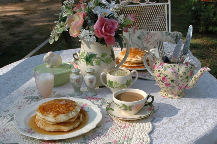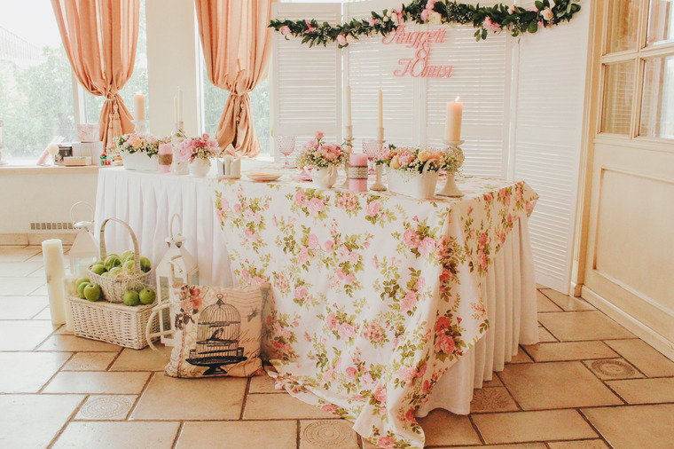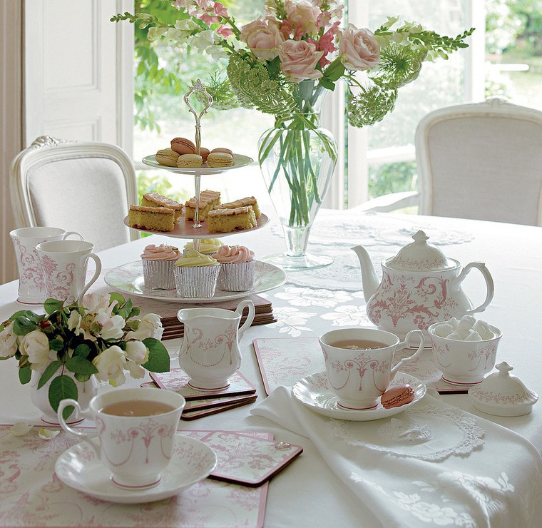 To design a table in the style of shabby chic, white and pink colors are used, as well as their various shades and combinations