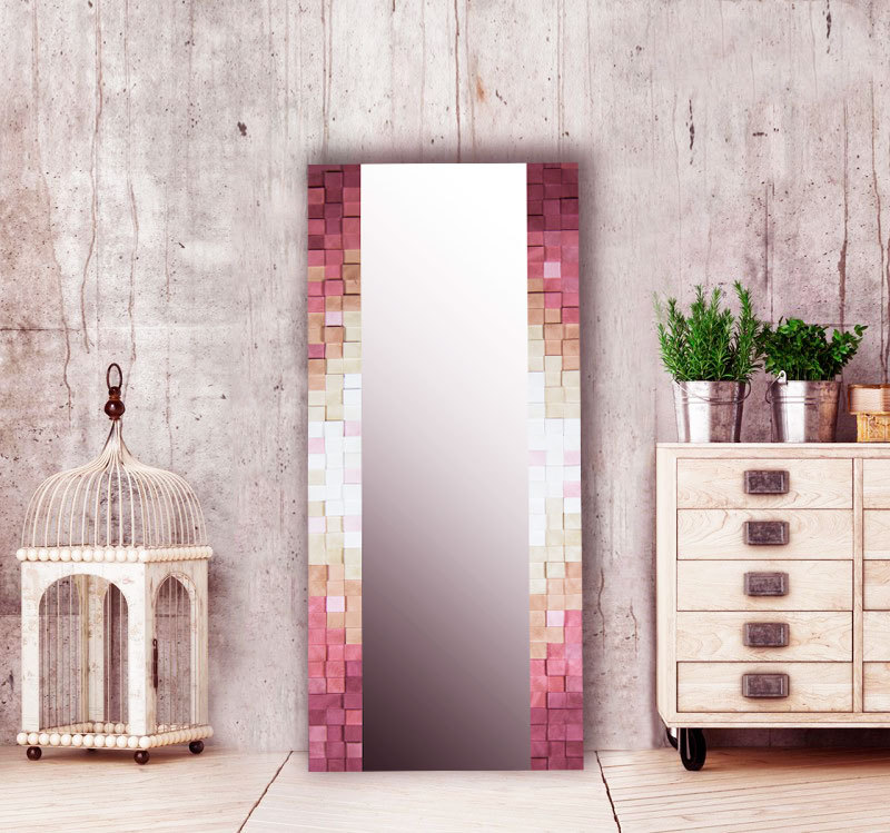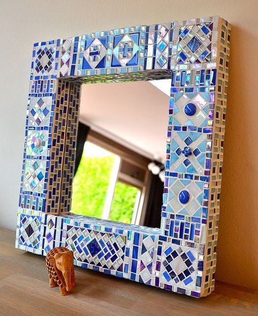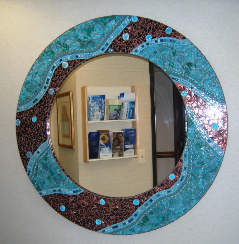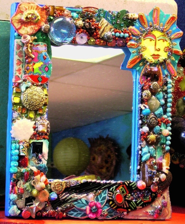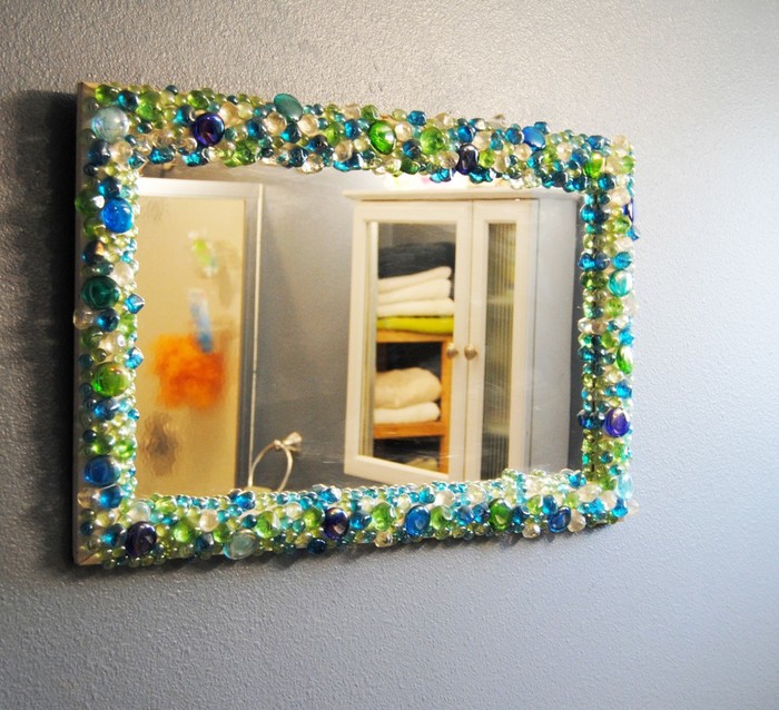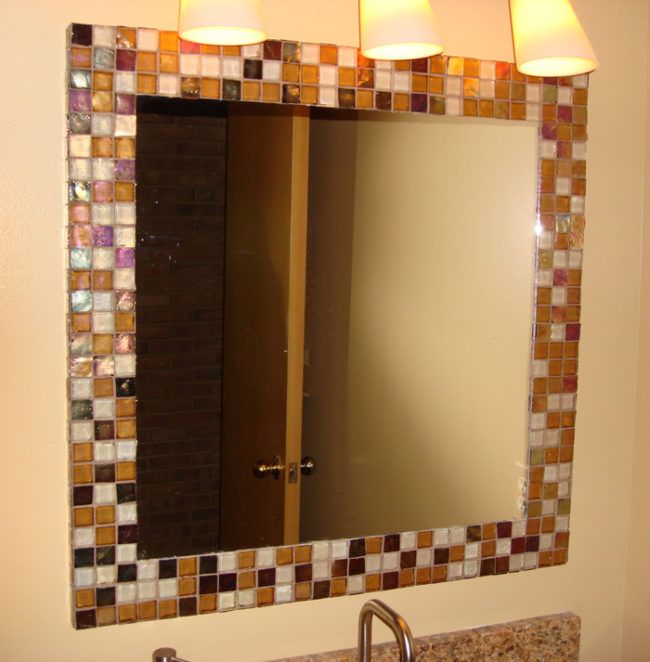 - Mirror from pieces of mosaic. There are two options for mosaics - the whole mirror or just the frame. To make a frame, you need to glue the edges of the mirror with colored glass particles, and then apply a layer of colorless varnish on them - in order to extend the life of the item and safety.