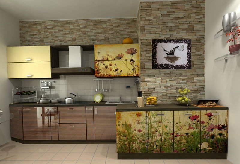 If the task is simply to decorate the room, then the choice already depends on the size of the kitchen. A huge picture on the entire wall will not fit miniature rooms, and one small application will be lost against the background of a large space. Choose something in between.