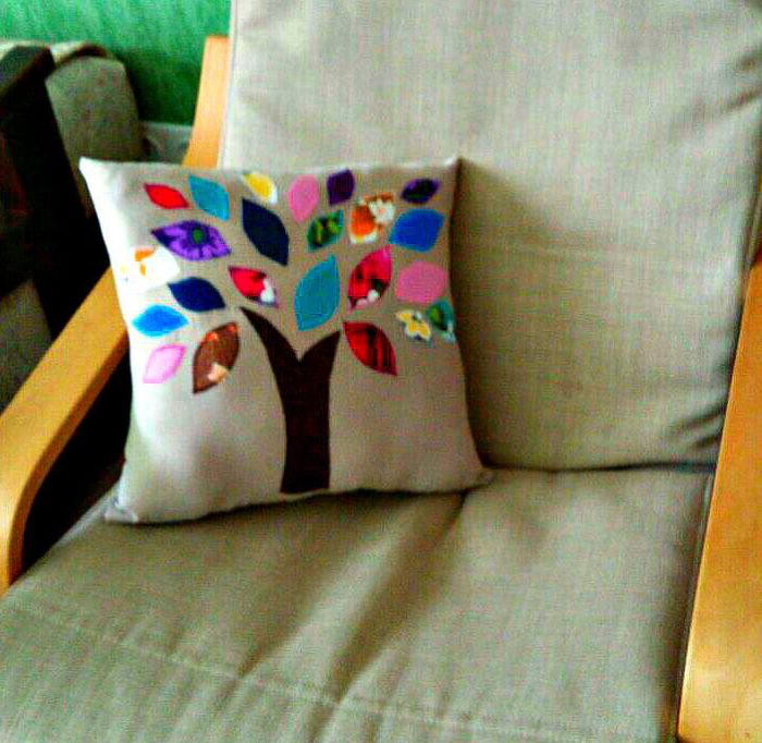 The pillow can be decorated with a tree ornament with colorful leaves. Pieces of fabric must be amassed with thread