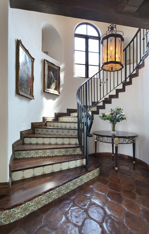 Faire un standard une échelle assez intéressant délivrer sa balustrade n'est pas à la manière traditionnelle. Il convient également de prêter attention à la place sous étapes. Si vous le posez avec des carreaux avec des ornements lumineux, alors l’image globale de l'intérieur rempli de positif, aura un look de fête.