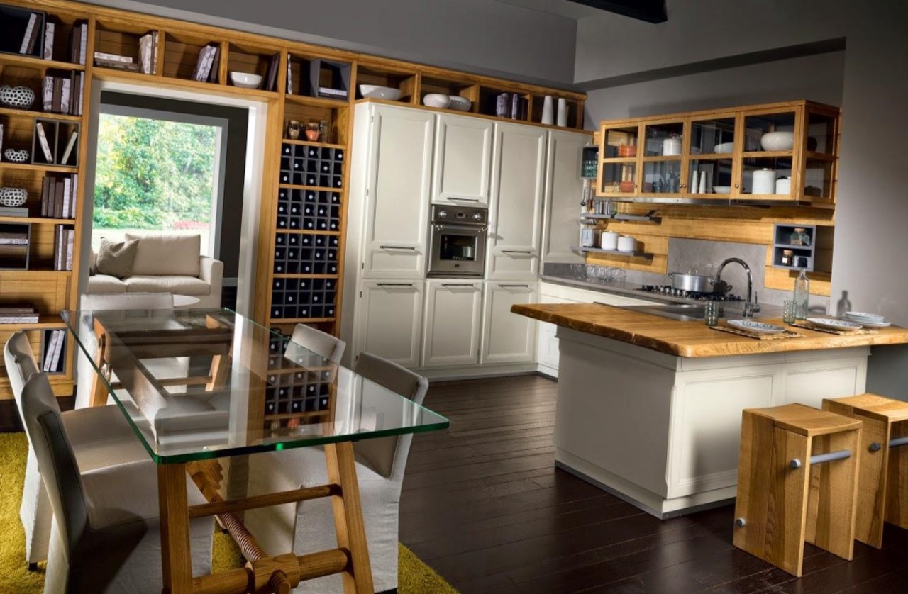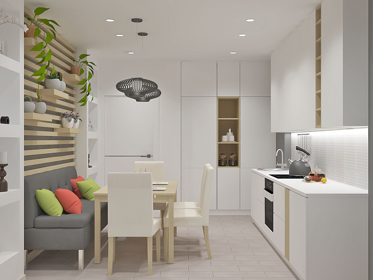 Les principes de la décoration des murs, du plafond et du sol de la cuisine sont les mêmes que dans la chambre à coucher: couleurs claires et utilisation de matériaux naturels. De plus, les carreaux de mosaïque peuvent être utilisés pour les murs. Pour le sol, les carreaux de céramique sont préférables, car la surface de bois est plus difficile à nettoyer.