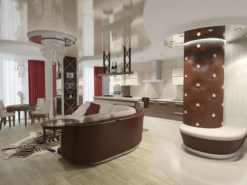 La convivialité aidera à créer des meubles bas rembourrés, recouverts de tissu lisse, ainsi que des oreillers décoratifs, des tapis et des lampes. Une variété de modèles et de matériaux vous permet de montrer votre imagination ici. Des lampes intéressantes en bois et autres matériaux naturels ajouteront une originalité au design du salon.