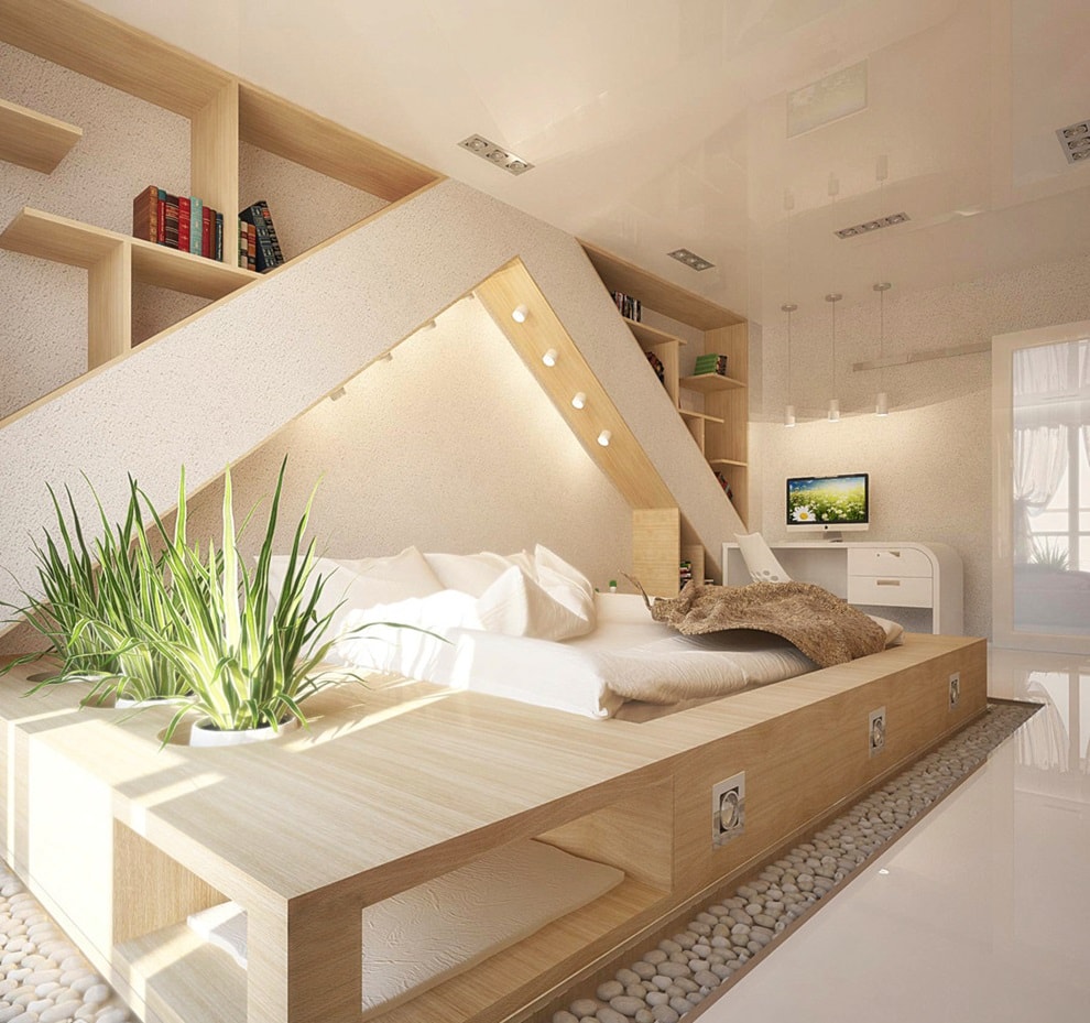 - Pour les intérieurs de chambres à coucher, il est préférable de choisir des murs de couleur pastel doux, l’utilisation de papier peint en liège ou de panneaux de bois est autorisée.