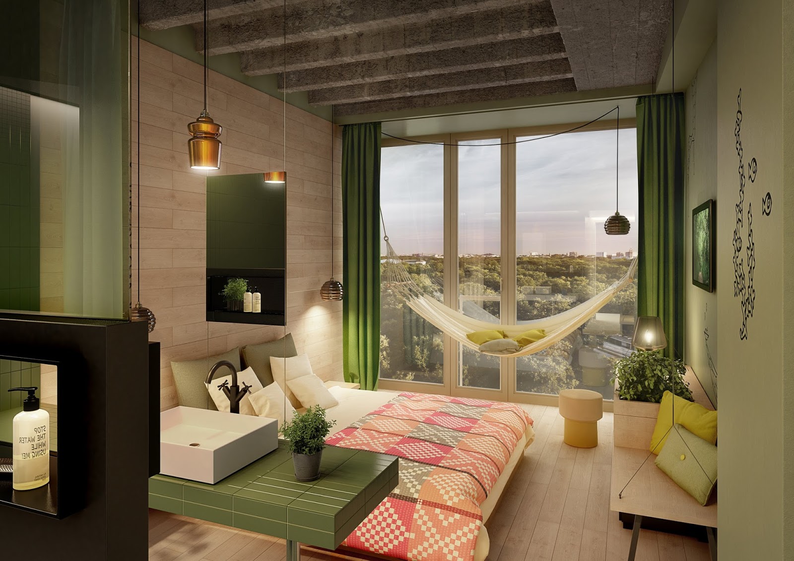 Si vous souhaitez créer un intérieur respectueux de l'environnement, vous devez vous armer de couleurs et de tissus verts. Après avoir peint un des murs avec des coussins verts éparpillés dans des taies faites par vous-même et en plaçant soigneusement vos fleurs préférées dans des pots en bois sur le rebord de votre fenêtre, vous vous rapprocherez du design chéri de la chambre écologique.