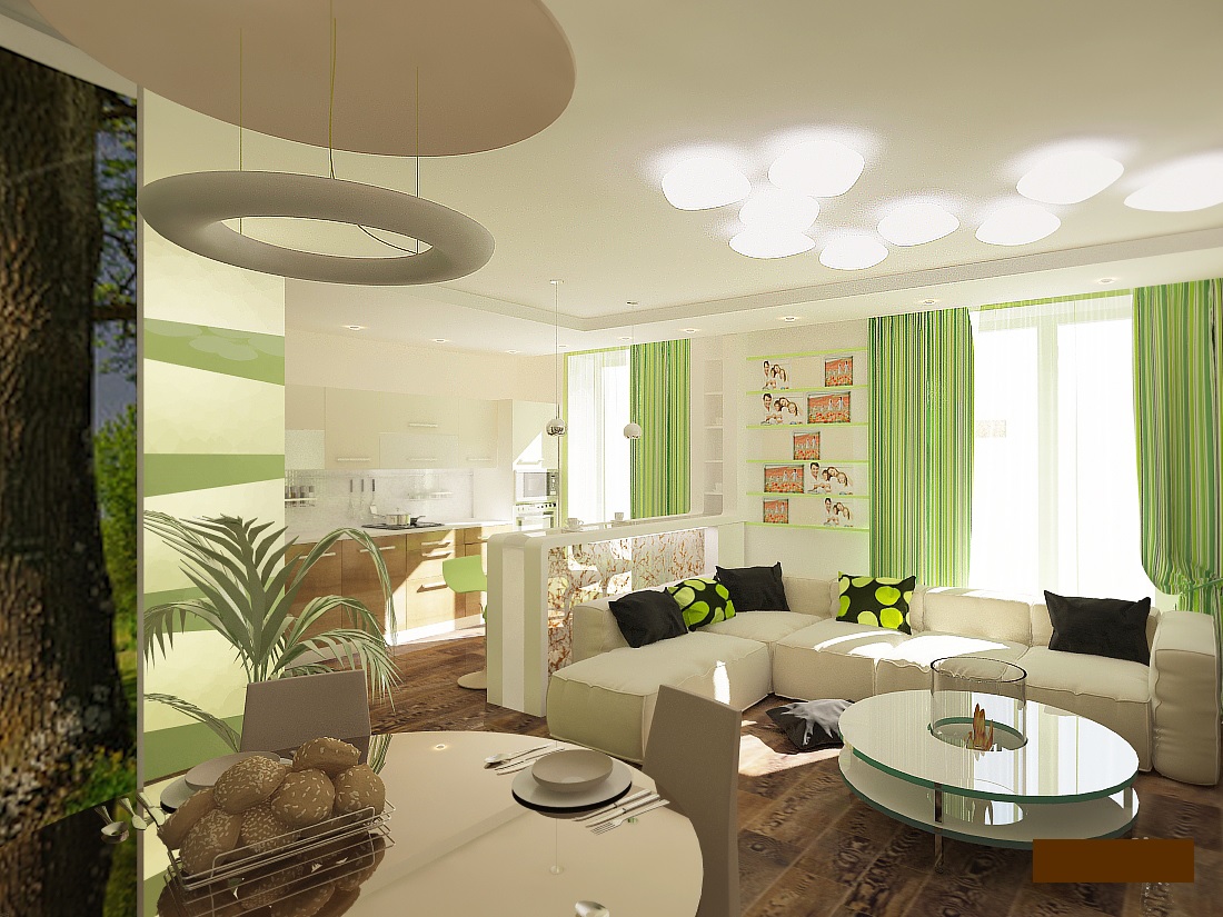 Ecostyle à l'intérieur de l'appartement se reflète dans la conception du salon. Le design de cette pièce doit être pensé avec le plus grand soin, car le salon est la pièce centrale de la maison, où se réunissent le plus souvent les invités et les membres de la famille.
