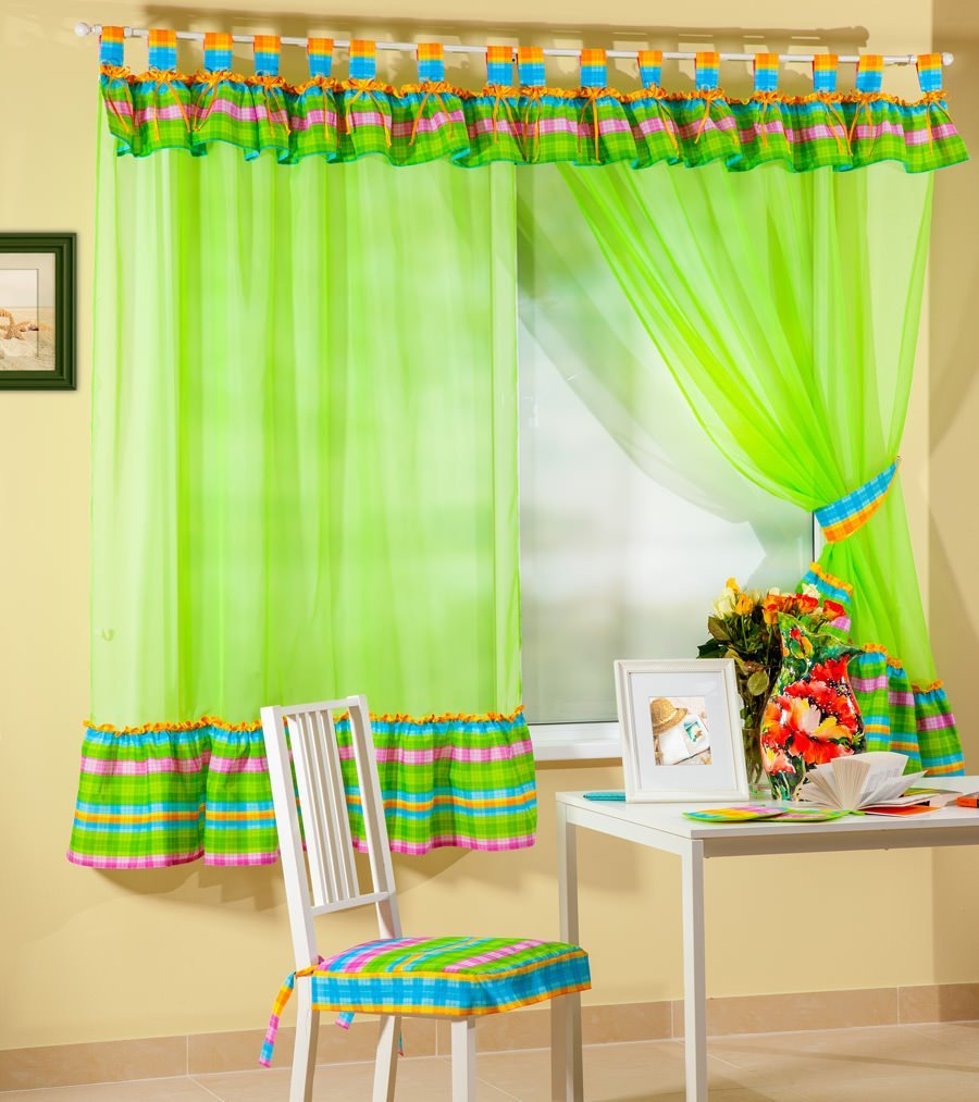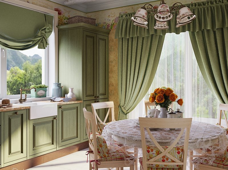 - La cuisine La couleur verte juteuse favorise parfaitement l'appétit, elle est donc souvent utilisée dans la conception de la cuisine. Les rideaux dans la cuisine sont mieux choisis parmi un matériau pratique, facile à laver et qui ne nécessite pas de soins particuliers. Nuances appropriées: vert clair, citron, olive saturée, couleurs claires. En cuisine, différents motifs floraux et géométriques ont fière allure.