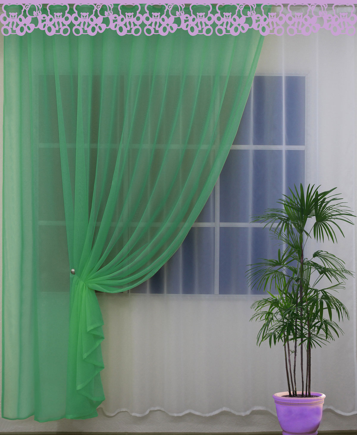 Dans la chambre à coucher, les rideaux verts vont bien avec le tulle blanc clair