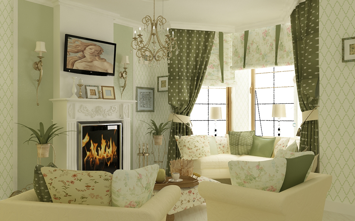 - Le but de la pièce. Chaque détail de l'intérieur est sélectionné en tenant compte de ce qu'il fait. Si c'est pour les enfants, la préférence devrait être donnée aux couleurs vives ou pastel. Pour une grande salle avec cheminée, des rideaux verts adaptés aux nuances de conifères ou d’oliviers nobles conviennent.