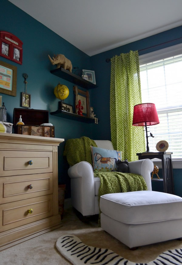 Chambre d'enfant avec rideaux verts, couvre-lit et tapis.