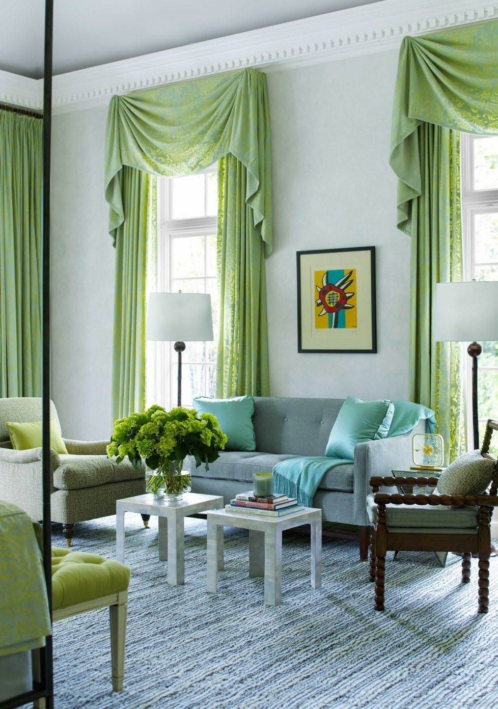 Les motifs légers sur les rideaux à la menthe accentuent l'élégance d'un style classique.