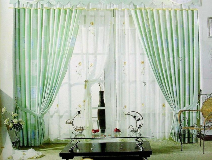 Les rideaux verts à l’intérieur du salon peuvent être complétés par divers éléments décoratifs: lambrequins, dentelles, volants et noeuds. Les concepteurs utilisent ce qu'on appelle le kiseya, qui est un fin fil de soie qui tombe comme un courant d'eau.
