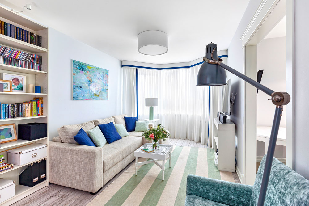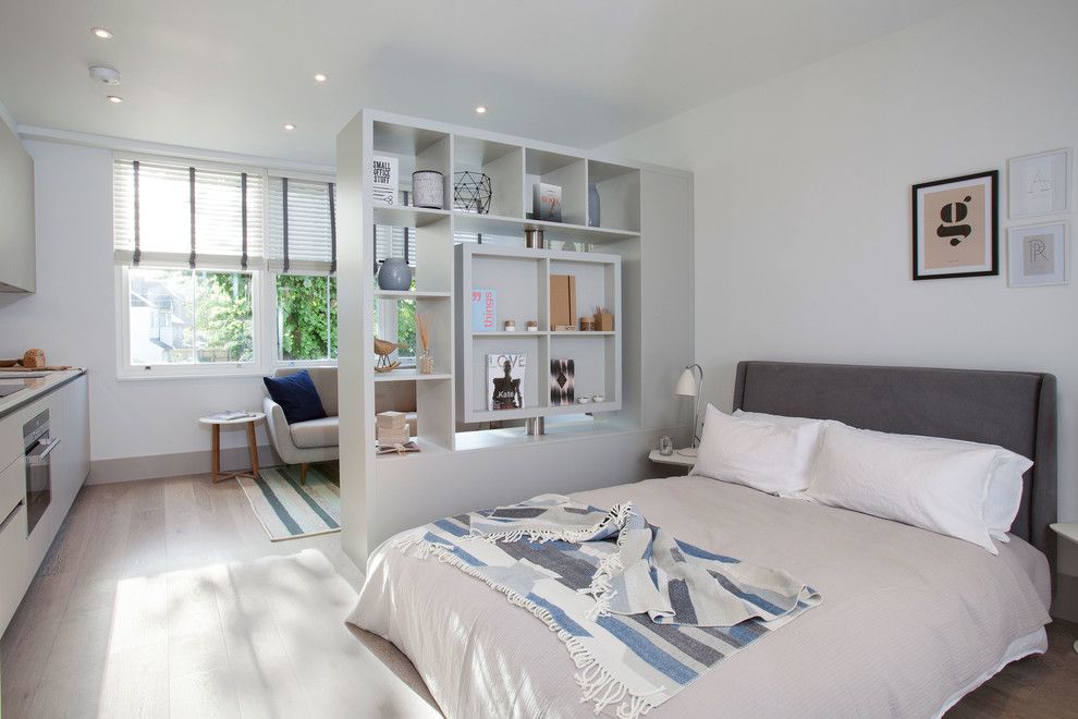 Cette distribution de style est toujours très populaire dans de nombreux intérieurs et aménagements modernes. Outre les proportions, le style de décoration est important - on suppose l'utilisation de colonnes et l'absence de cloisons de portes étroites.