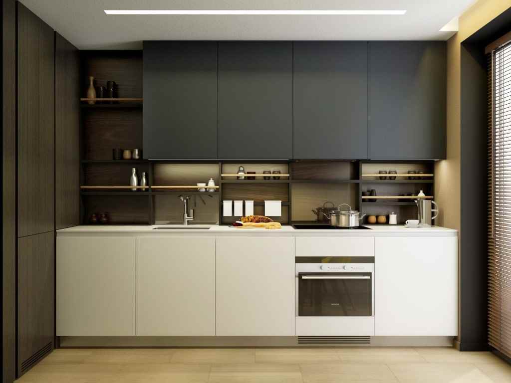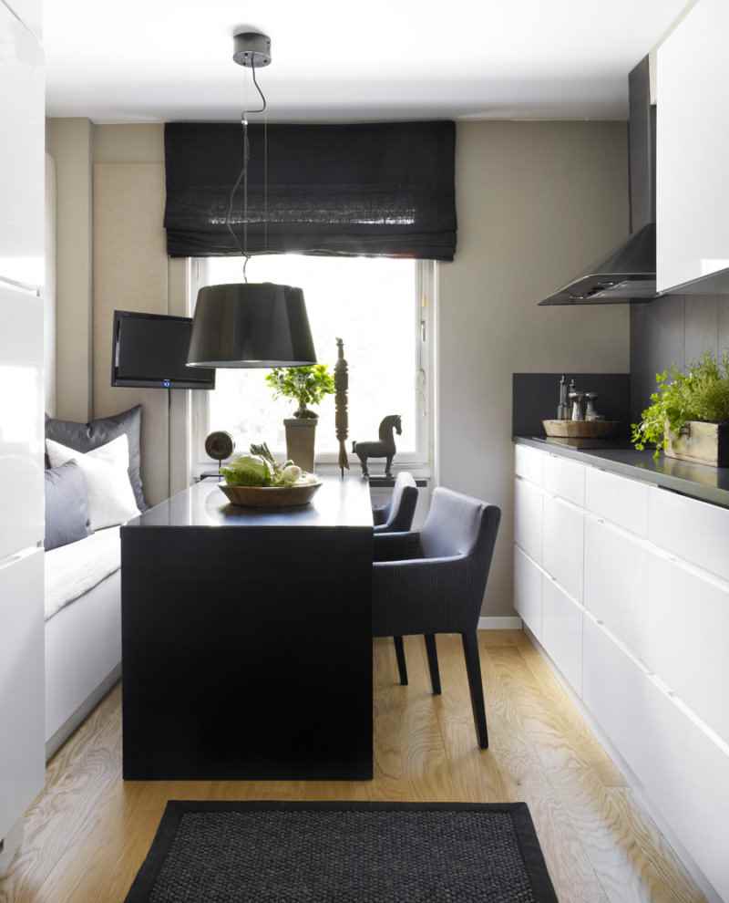 - Une seule rangée. Convient pour créer un intérieur moderne. Installez un support de console où vous pouvez manger et cuisiner.