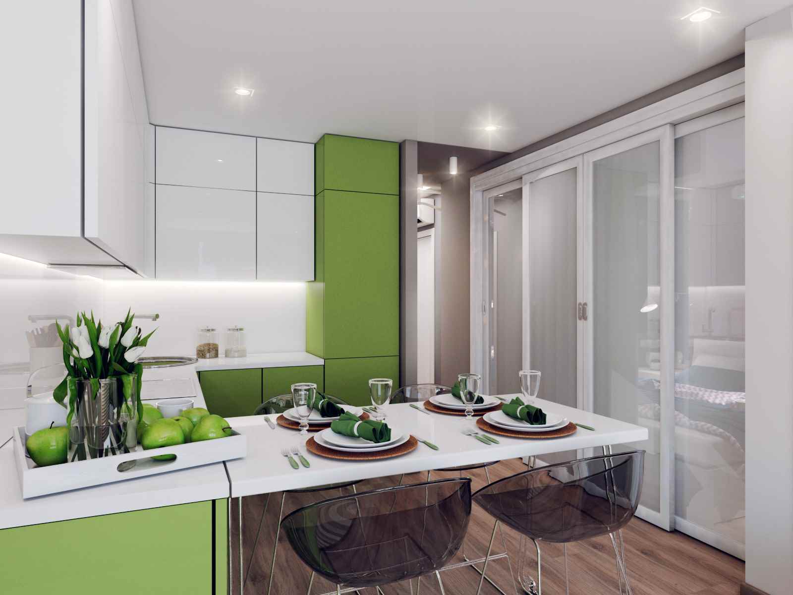 - L'éclairage Spot, bandes de diodes et petites lampes conviennent. La première source de lumière est pratique car elle peut être positionnée n’importe où. Convient aux projecteurs, au plafond, aux murs et aux armoires. Une grande quantité d'éclairage vous permettra de régler le niveau de lumière.