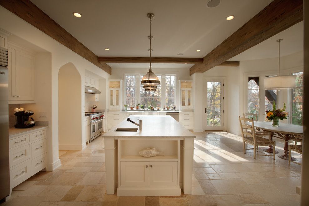 Une cuisine de style champêtre comporte un tablier en pierre, en brique ou en tuile.