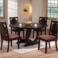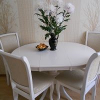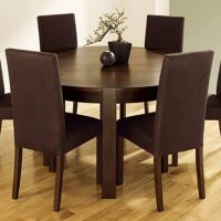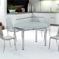 La version ronde de la table à manger convient aux pièces de grande surface. De tels modèles peuvent différer les uns des autres non seulement par le diamètre de la zone de travail, le matériau, mais également par le nombre de pieds: il peut y en avoir trois ou quatre. Il convient également de noter le fait que ces conceptions sont généralement placées au centre de la cuisine. Dans un autre scénario, cela aura l'air ridicule et inapproprié. Le principal avantage du choix d’un tel comptoir réside dans le fait qu’il n’a pas de coins tranchants, ce qui peut nuire aux enfants et même aux adultes.