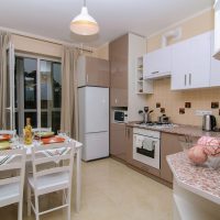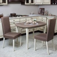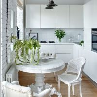 Mais que se passe-t-il si l'espace de la kitchenette est complètement réduit? C'est simple, vous pouvez également organiser la table, mais, bien sûr, plus petite au centre.